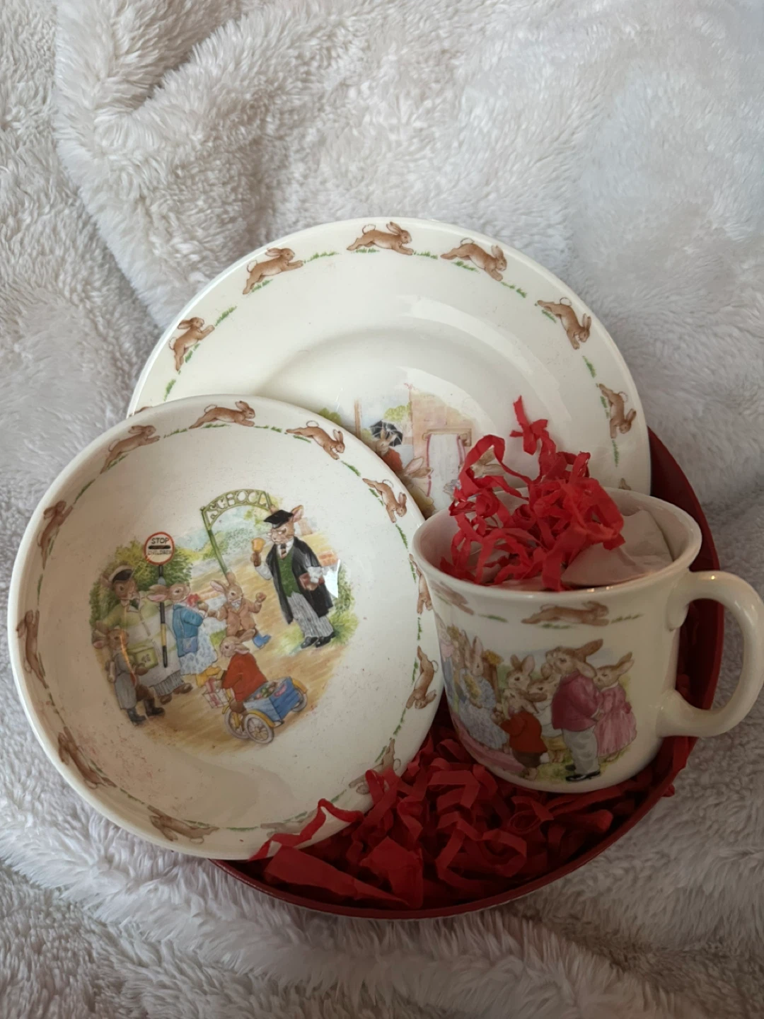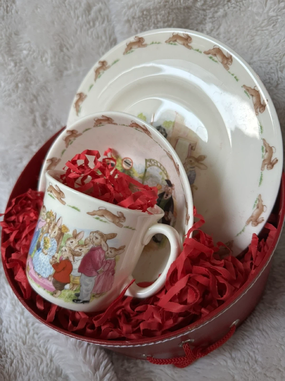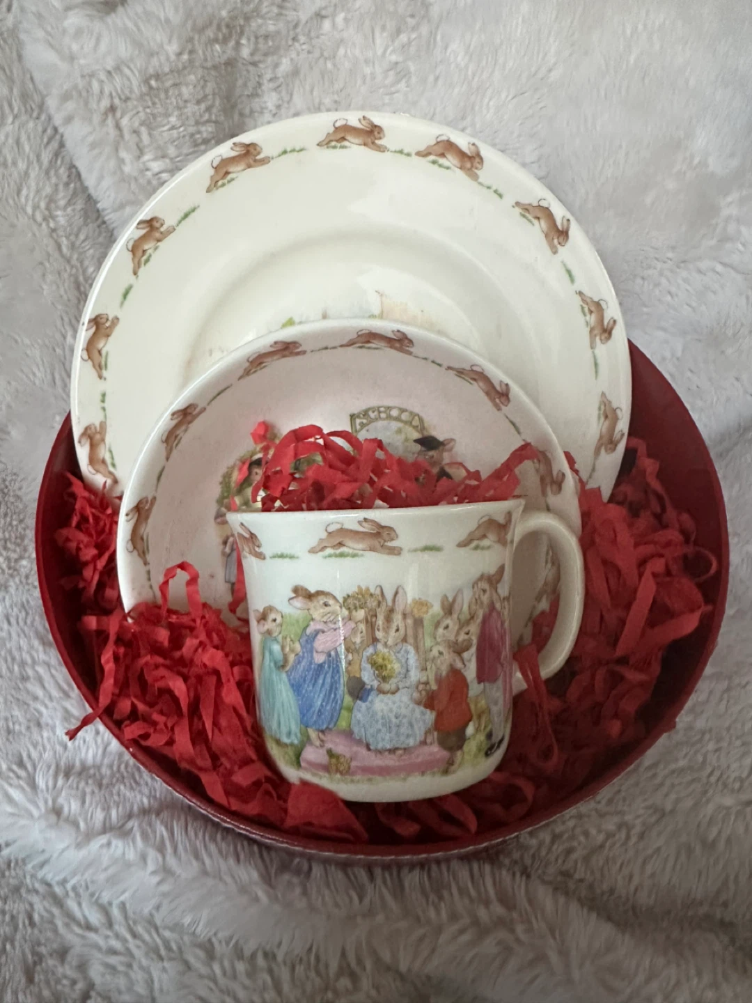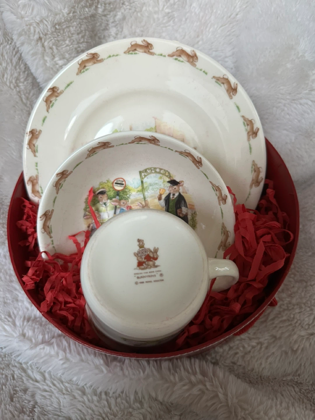 Selling a Royal Doulton Bunnykins 3-piece set! This adorable set includes a plate, bowl, and mug, all featuring the classic Bunnykins design. Perfect for a child's mealtime or as a charming collectible. Comes in a beautiful red box.