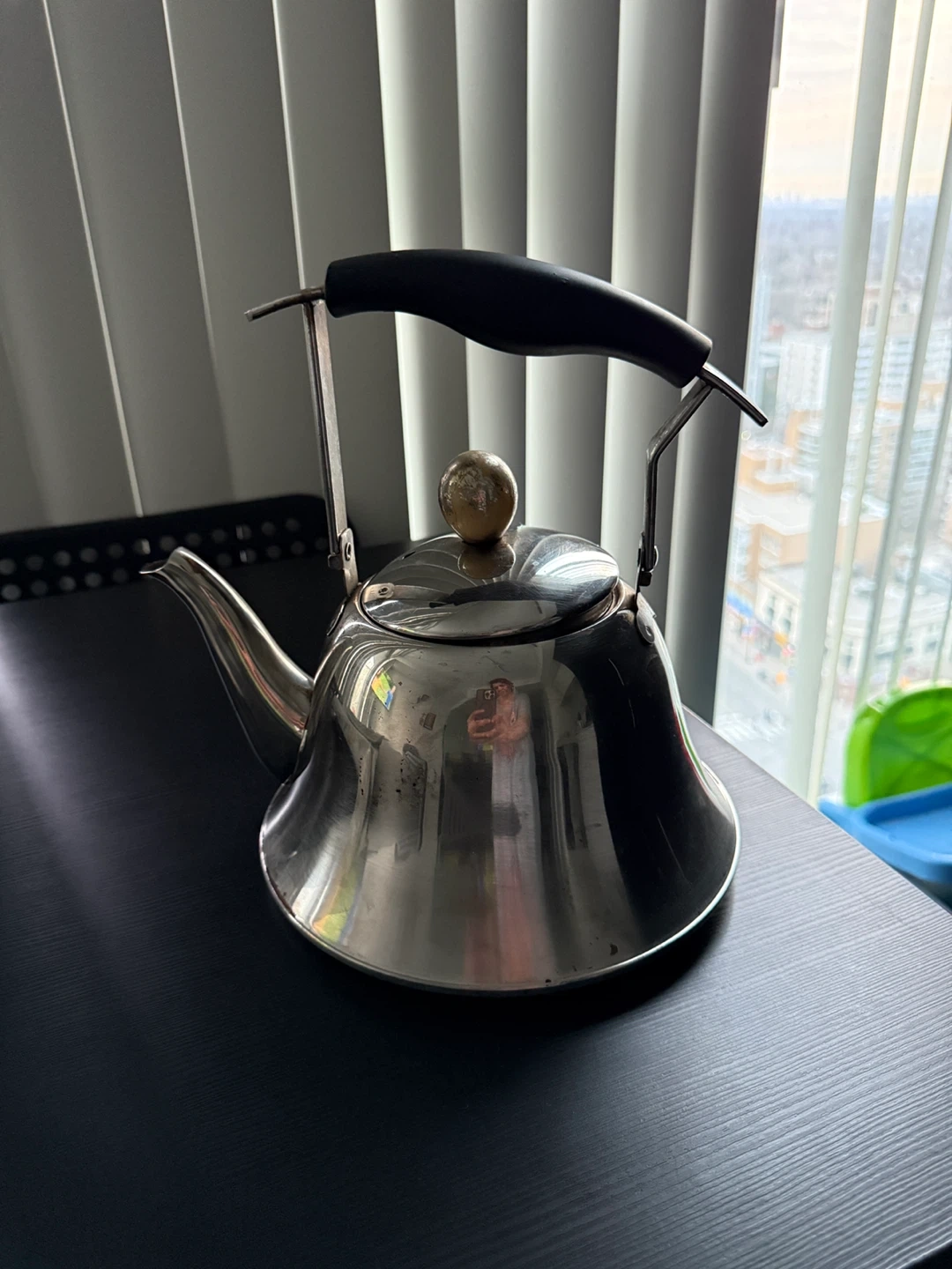 Selling a stainless steel kettle. It's in good condition and ready for a new home! It features a black handle and a silver finish.
