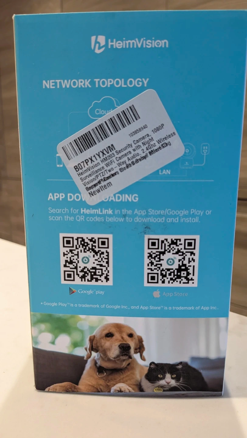 Selling a brand new HeimVision HM203 Smart WiFi Camera! It comes in its original box and includes all the components: camera mount, screw set, power adapter, USB cable, LAN cable, and user manual.