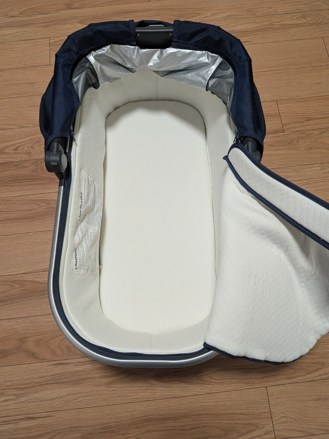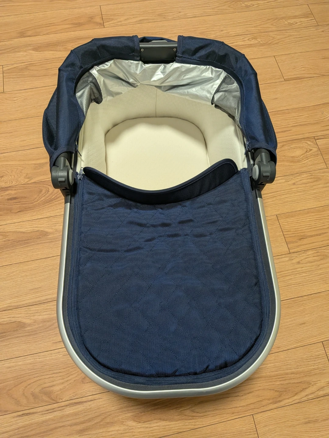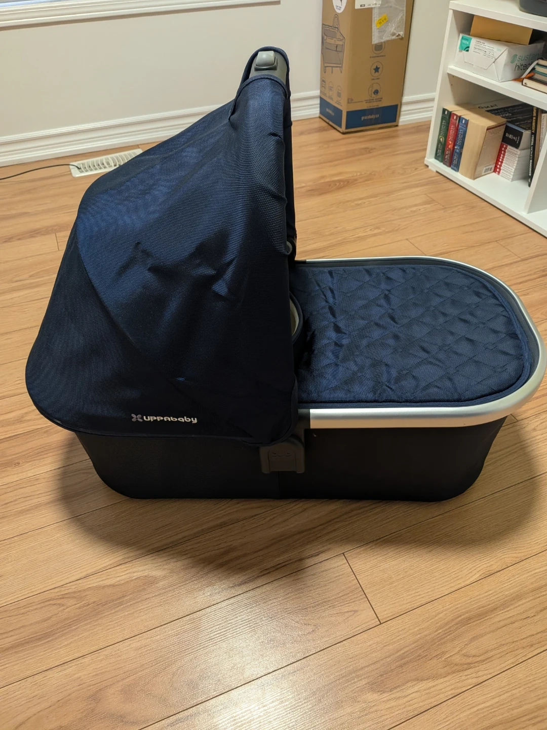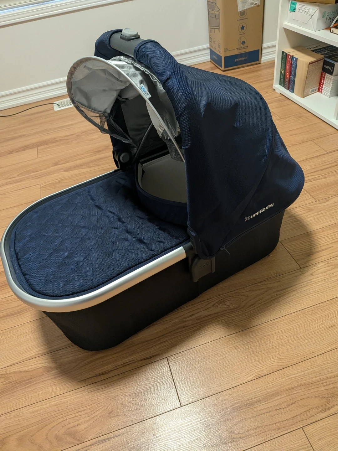 Selling an Uppababy bassinet in navy blue! It's in great condition and ready for a new little one. Perfect for strolls or naps!