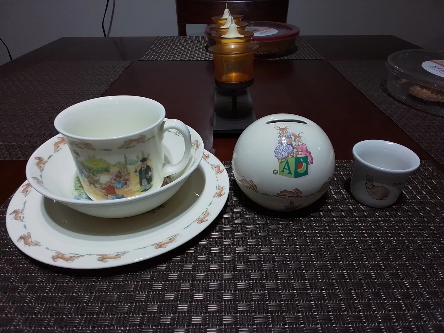 Buy & SellRoyal Doulton Peter Rabbit Dish Set & Coin BankRoyal Doulton Peter Rabbit Dish Set & Coin Bank$50I'm selling a cute Royal Doulton Peter Rabbit dish set that includes a plate, bowl, and mug, along with a matching Peter Rabbit coin bank and egg cupConditionNewWHERE TO MEETCheck LocationView MapSELLERverifiedKathyBrock650 reviews0 chats·0 favorites·13 viewsSEND CHAT TO SELLERHi Kathy! I’m interested in your listing.Hi Kathy! I’m interested in your listing.Get the Karrot app to chatSign In to chat