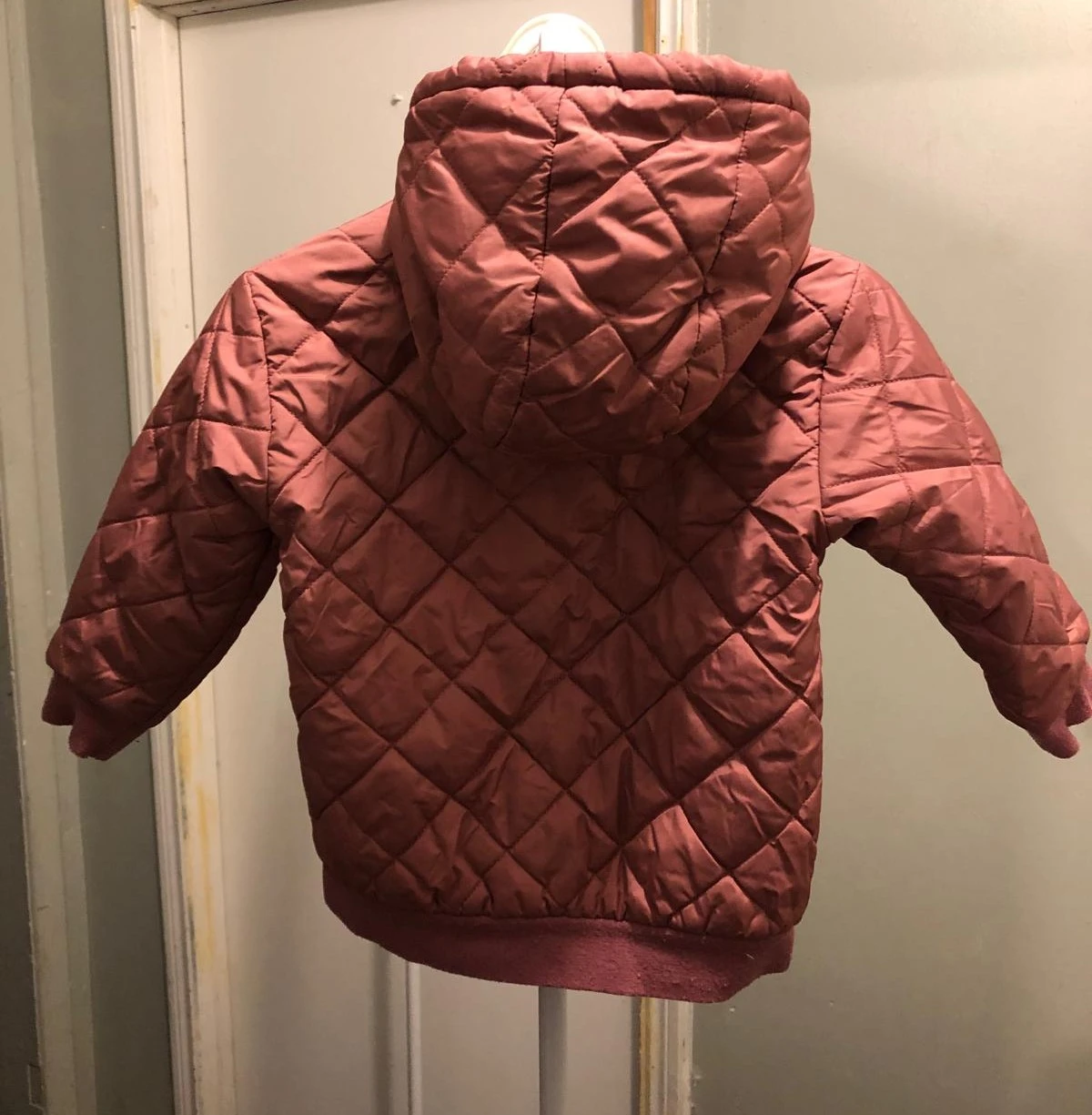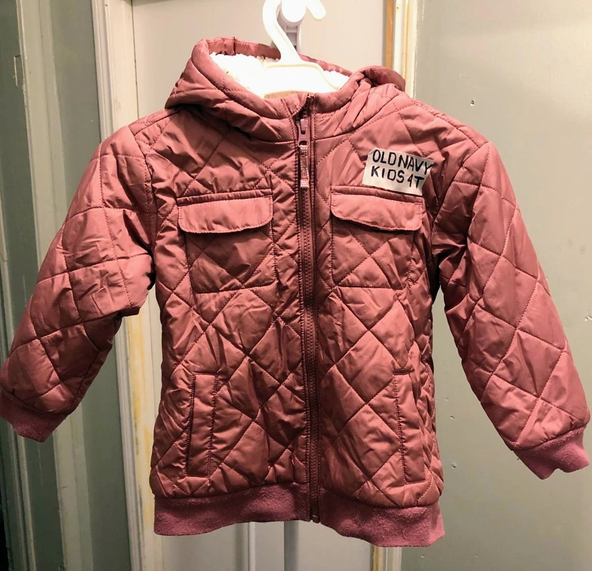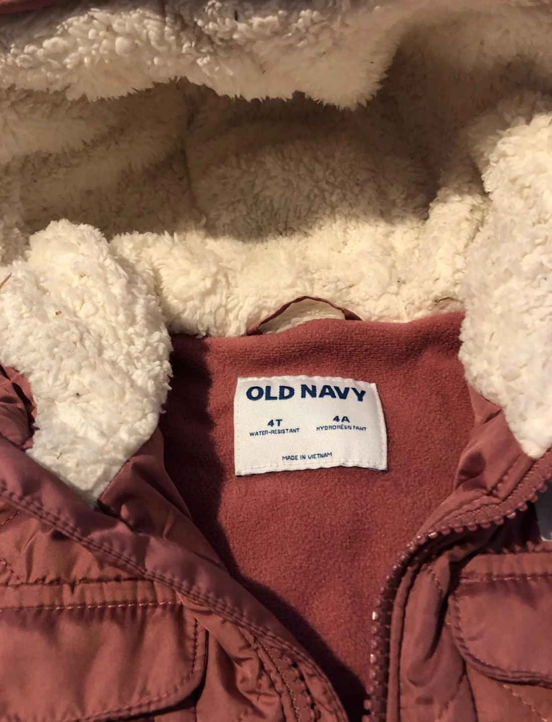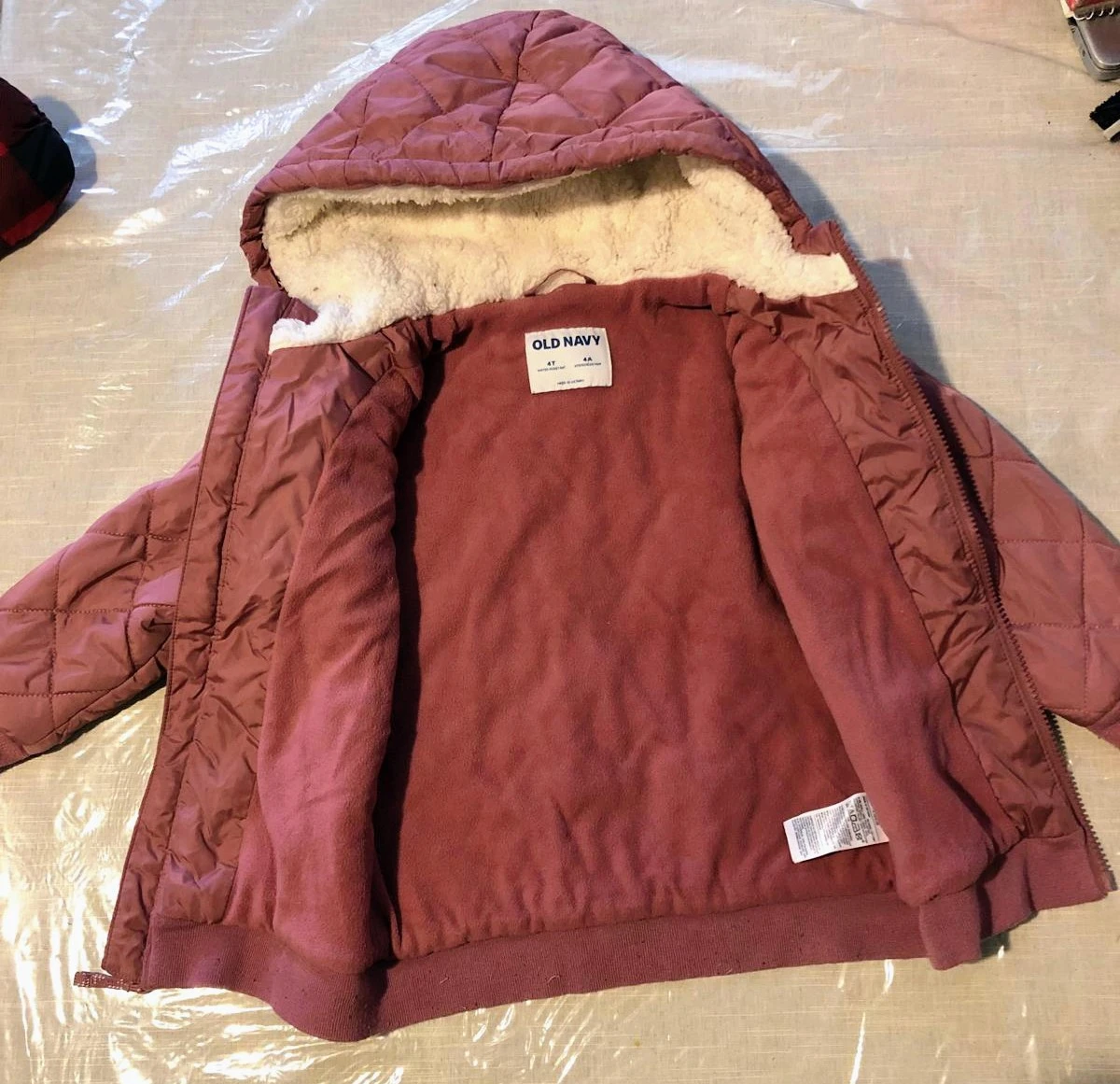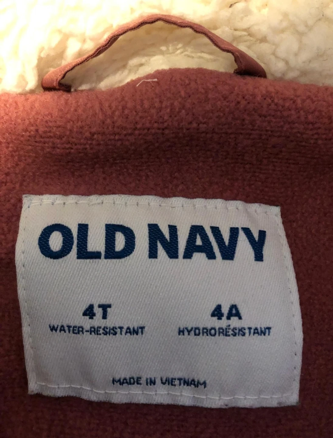 Here's a cute Old Navy jacket for kids! It's size 4T and water-resistant, perfect for keeping your little one dry. The jacket is a lovely mauve colour and has a cozy sherpa-lined hood.