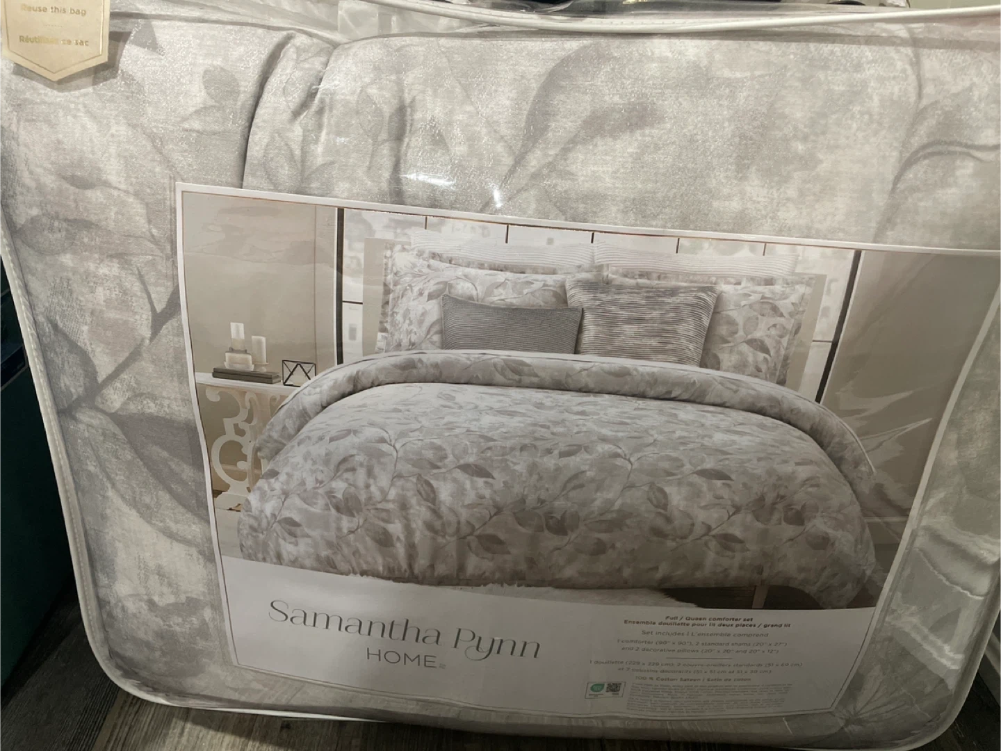 Selling a Samantha Pynn Home full/queen comforter set! The set includes one comforter (90" x 90"), two standard shams (20" x 27"), and two decorative pillows (20" x 20" and 20" x 12")