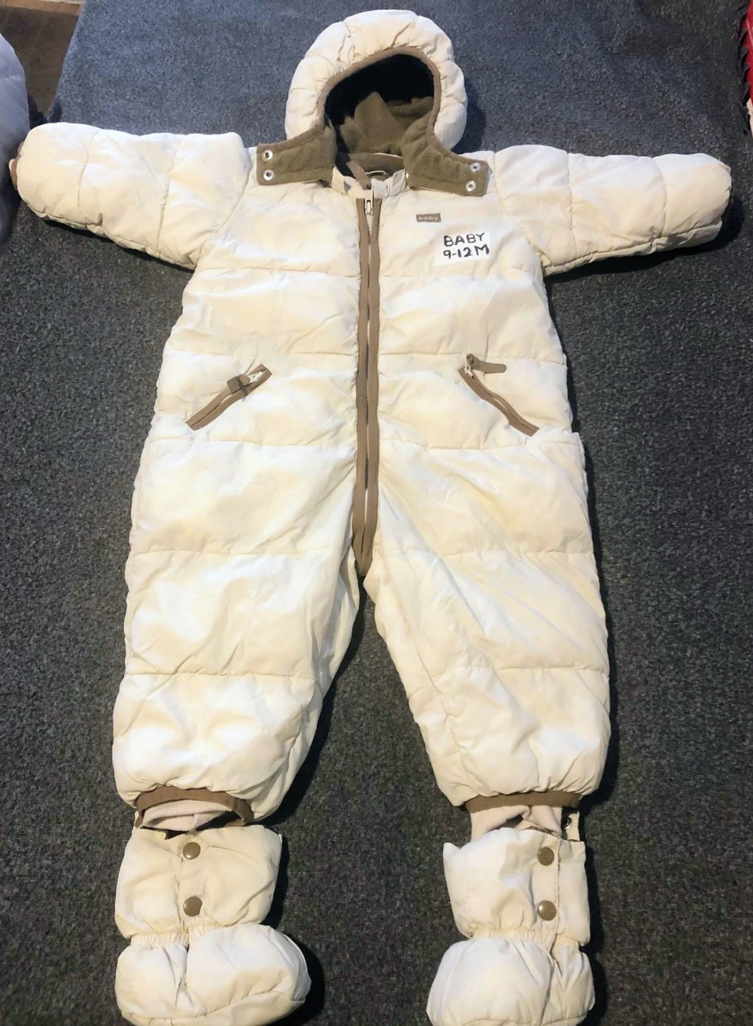 Selling a cute H&M baby snowsuit in excellent condition! It's a size 9-12M and perfect for keeping your little one warm during the winter months. The snowsuit is a cream colour with brown accents.