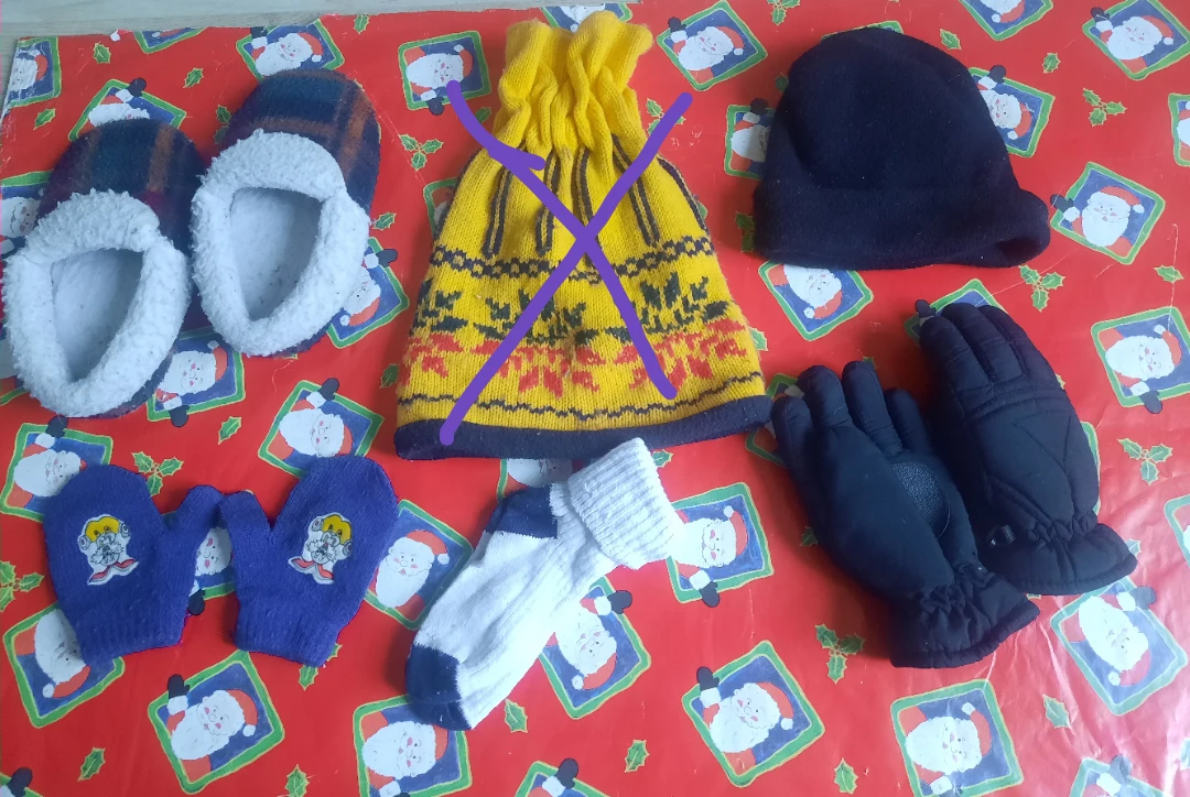 FREE A bundle of Kids winter accessories! Includes a pair of kids slippers, a pair of black gloves, a pair of blue mittens, and a pair of white socks and black hat. All items are in used condition and ready to keep you warm this winter