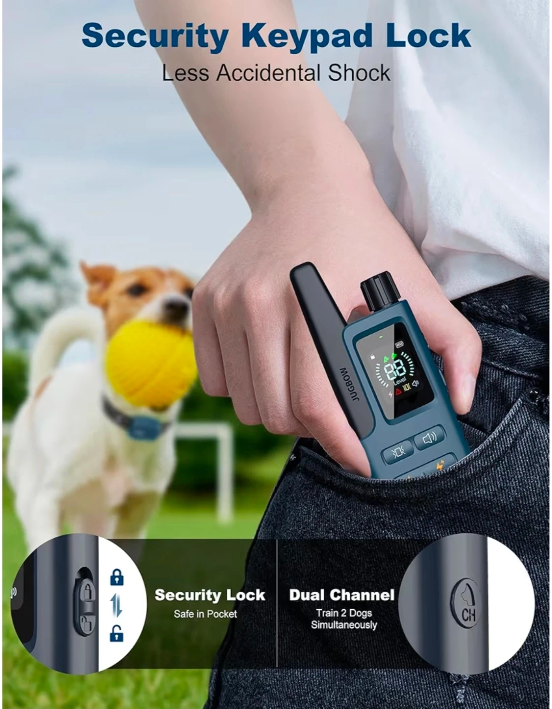 The collar is adjustable for dogs 10-120lbs and can be cut off for a custom fit. It also has a security keypad lock to prevent accidental shocks and a dual channel to train 2 dogs simultaneously. The remote and collar are quick charging and ultra last long time