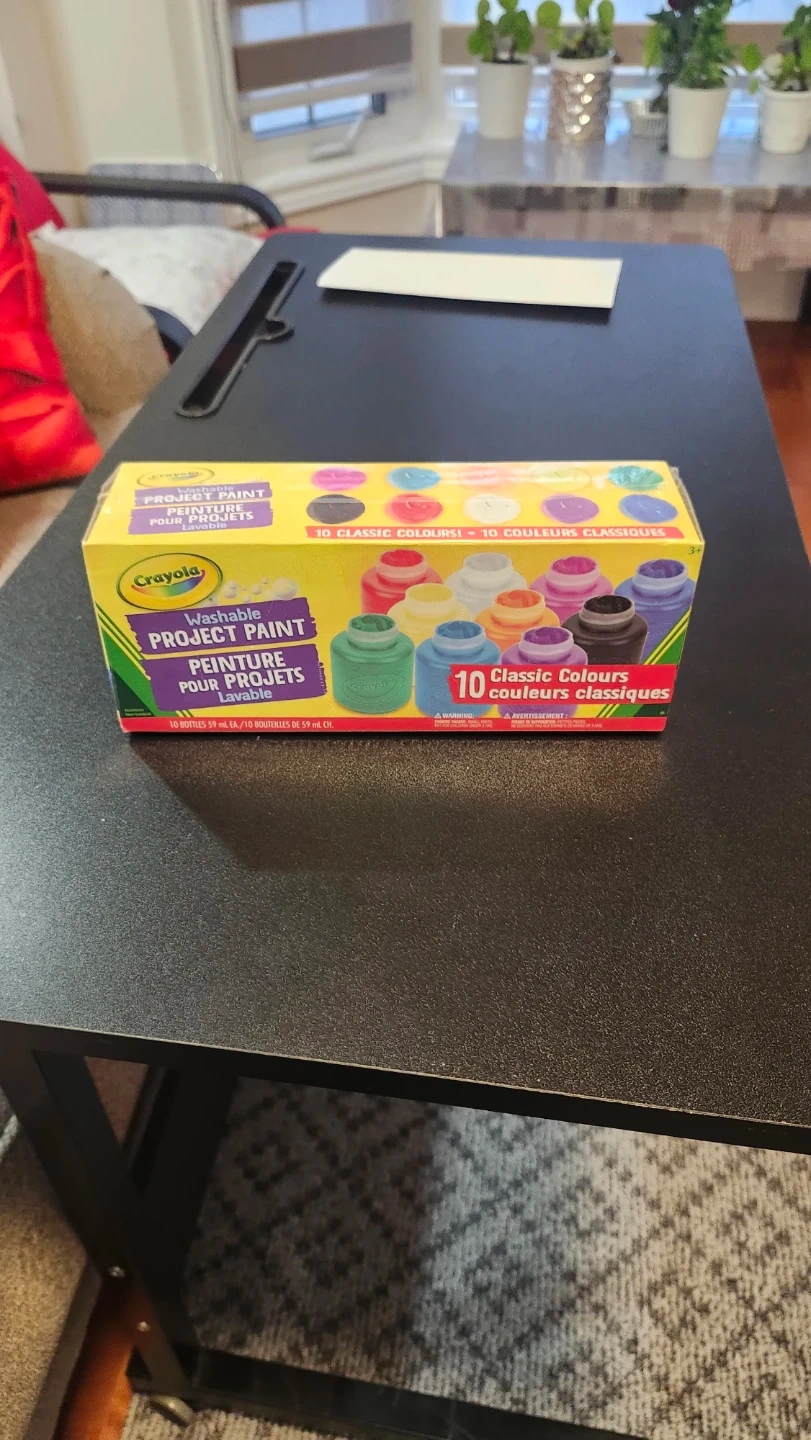 Selling a brand new box of Crayola Washable Project Paint! This set includes 10 classic colours, perfect for arts and crafts projects. Each bottle contains 59 mL of paint. Great for kids, moms, and teachers alike!