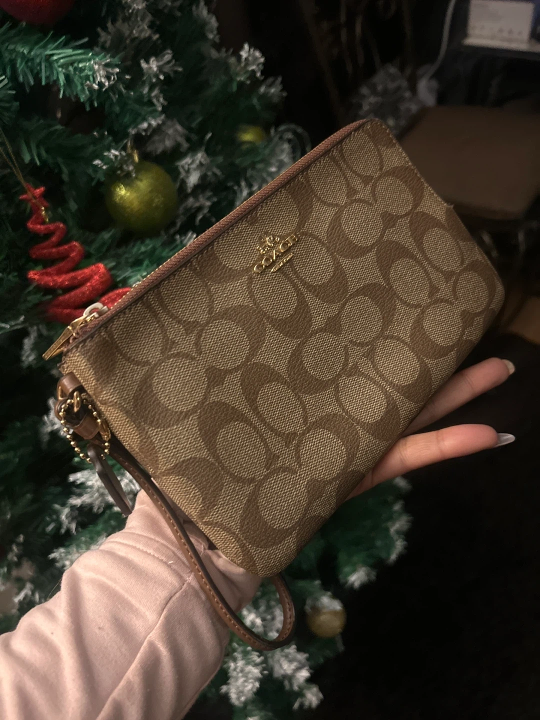 Selling a Coach wristlet in brown. It has the Coach logo design on the exterior. It has a zipper closure and a wrist strap. Perfect for carrying essentials!