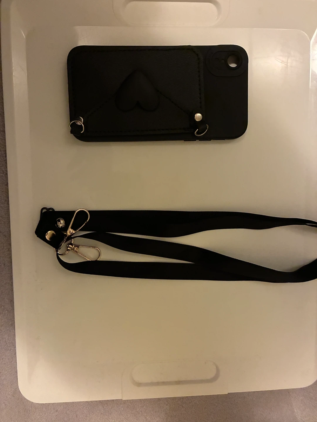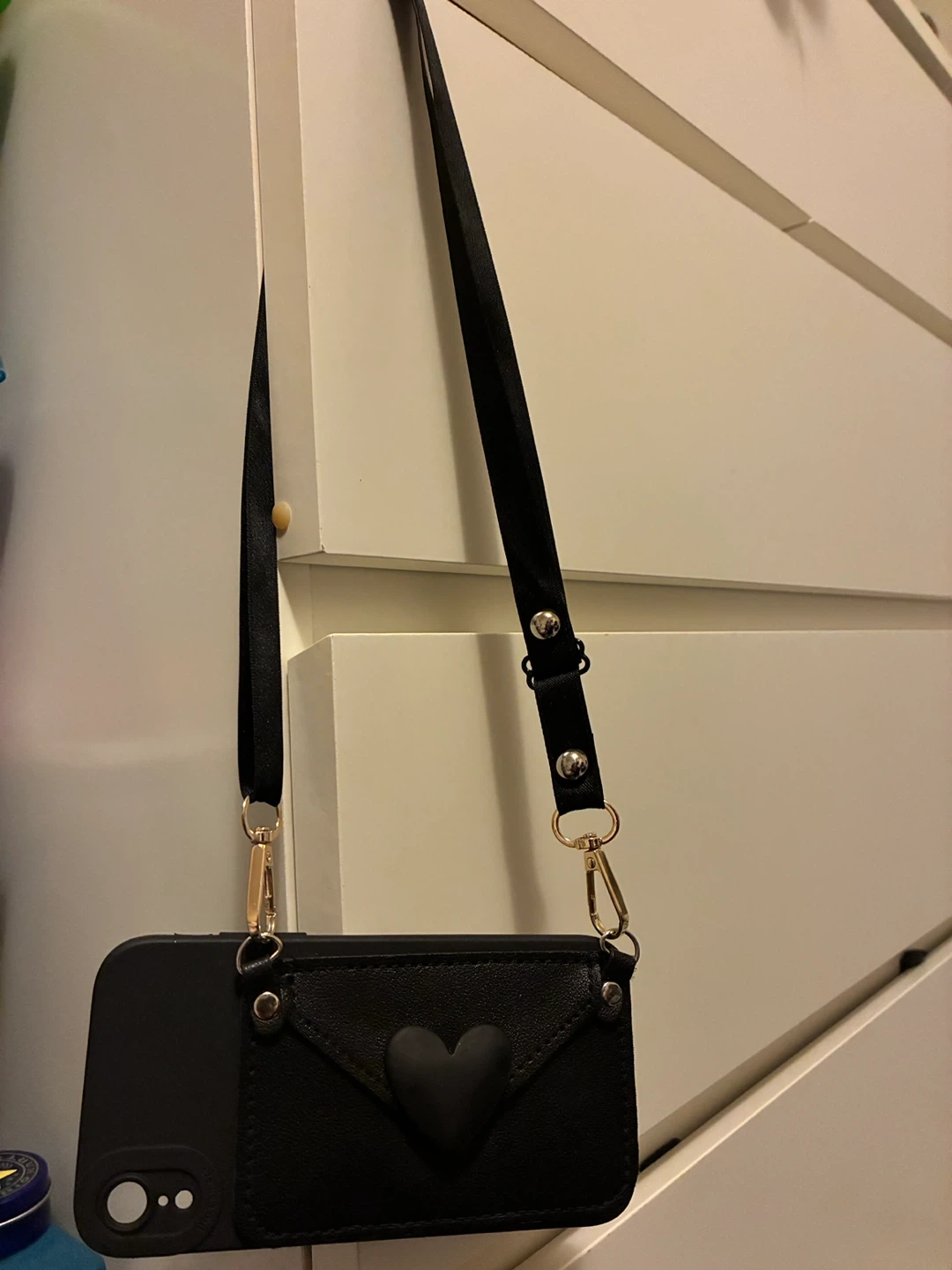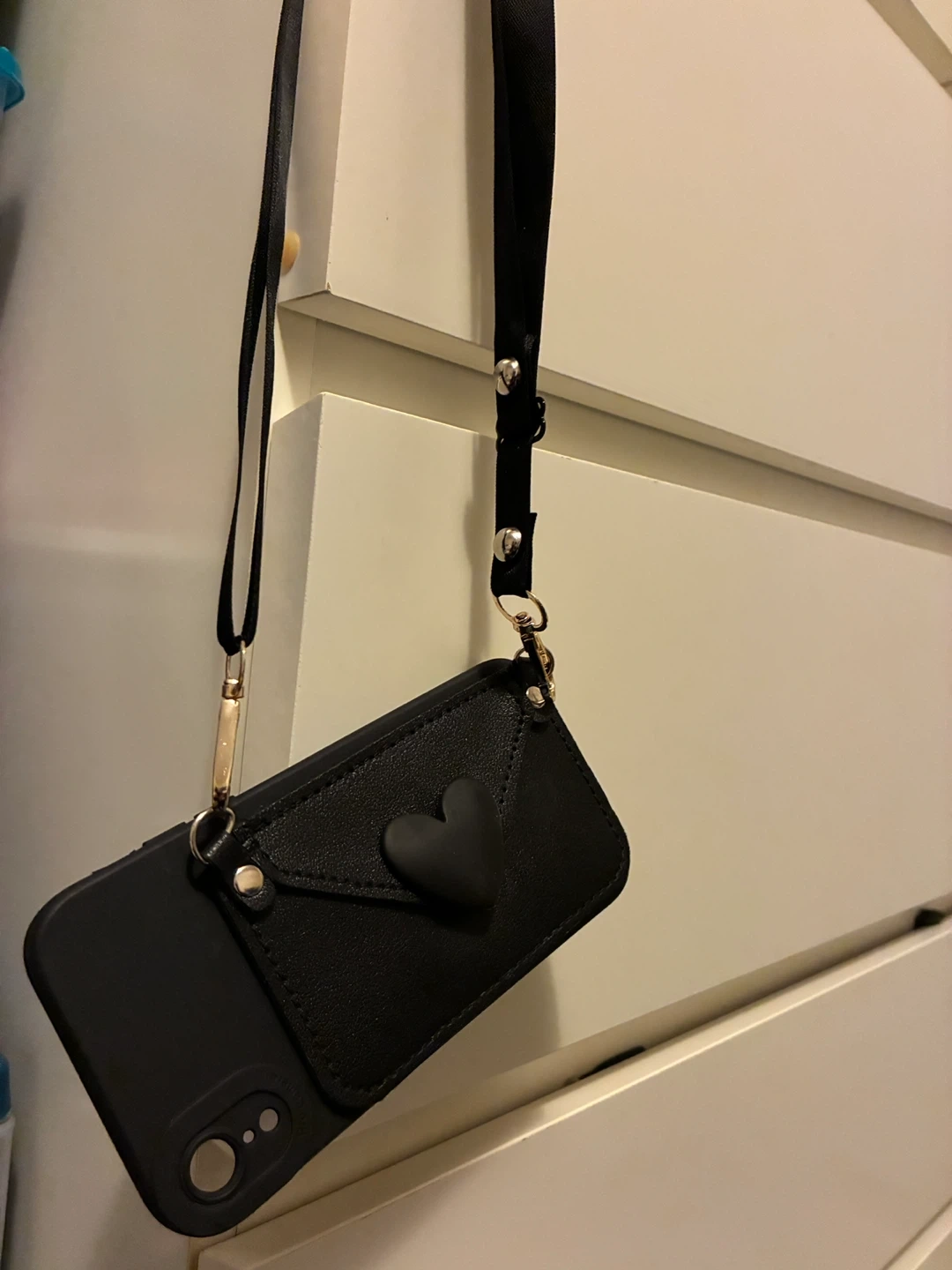 Selling a cute Korean style black phone case with a heart design and a matching adjustable black strap. It's in great condition and ready to use! Perfect for keeping your phone secure and stylish.
