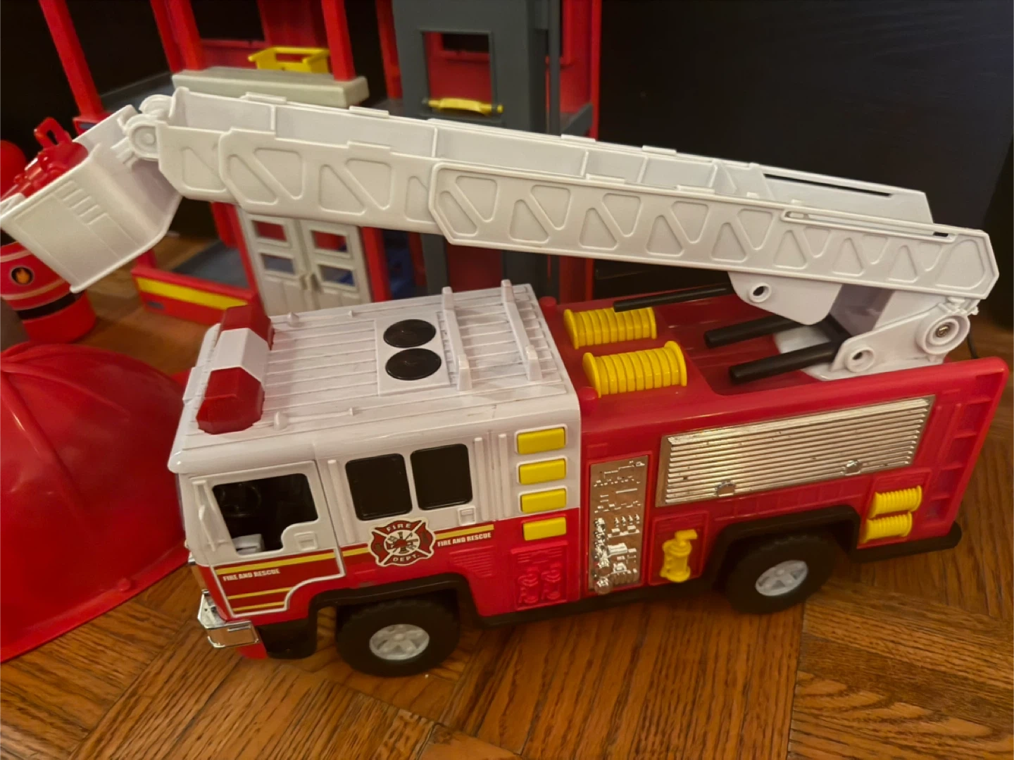 All the buttons on the fire station and for truck work and make noises and lights go off!!