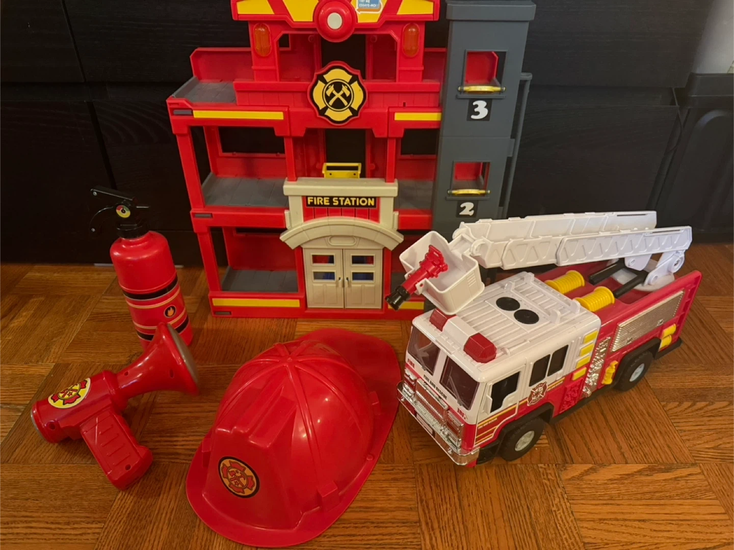 Fire station playset with a fire truck, fire extinguisher, megaphone, and fire helmet. Great for imaginative play!
