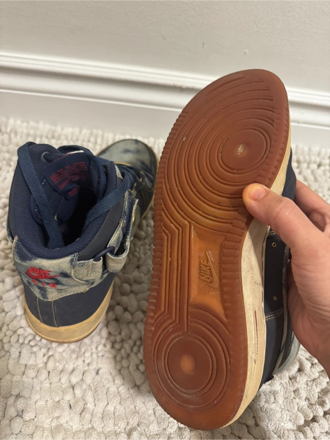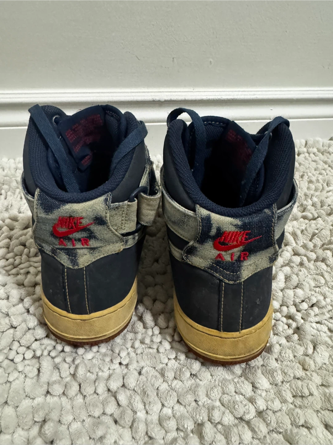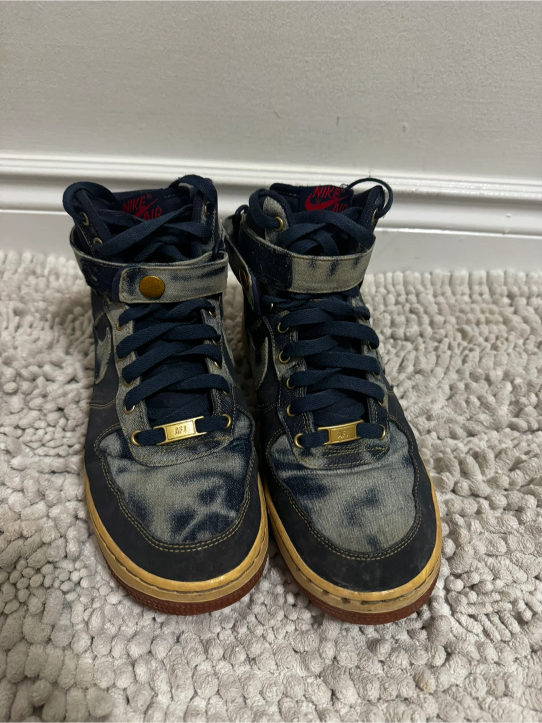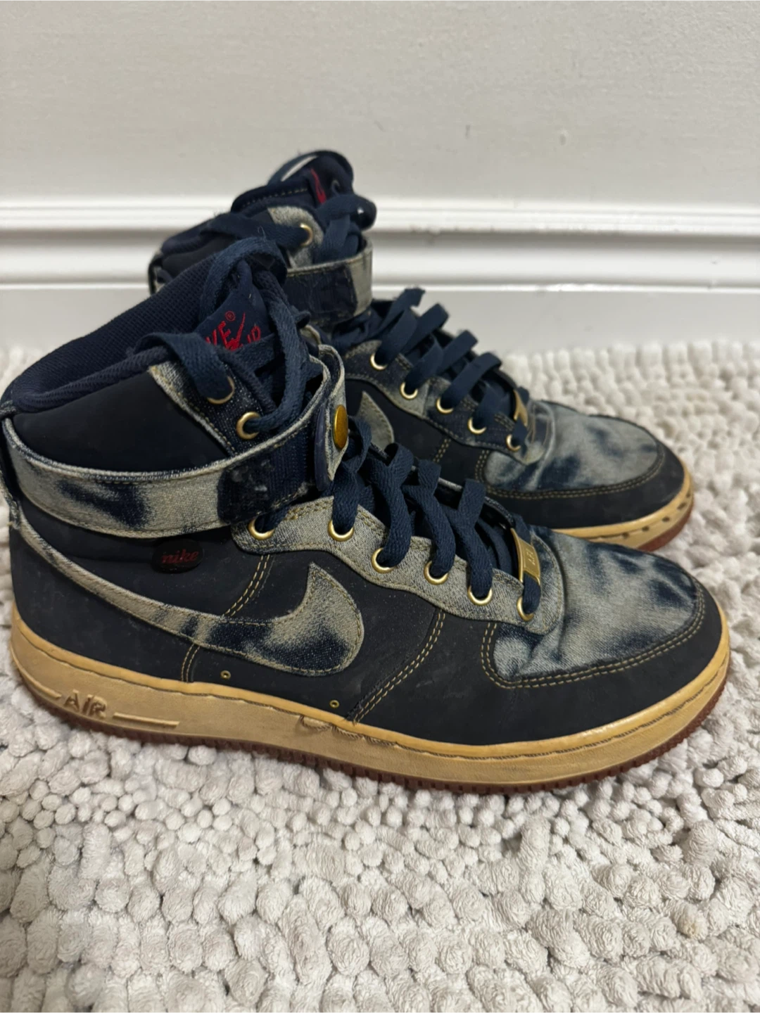Selling a pair of Nike Air Force 1 High '07 denim shoes. They are in good condition and a size 8.5 in men’s sizing.