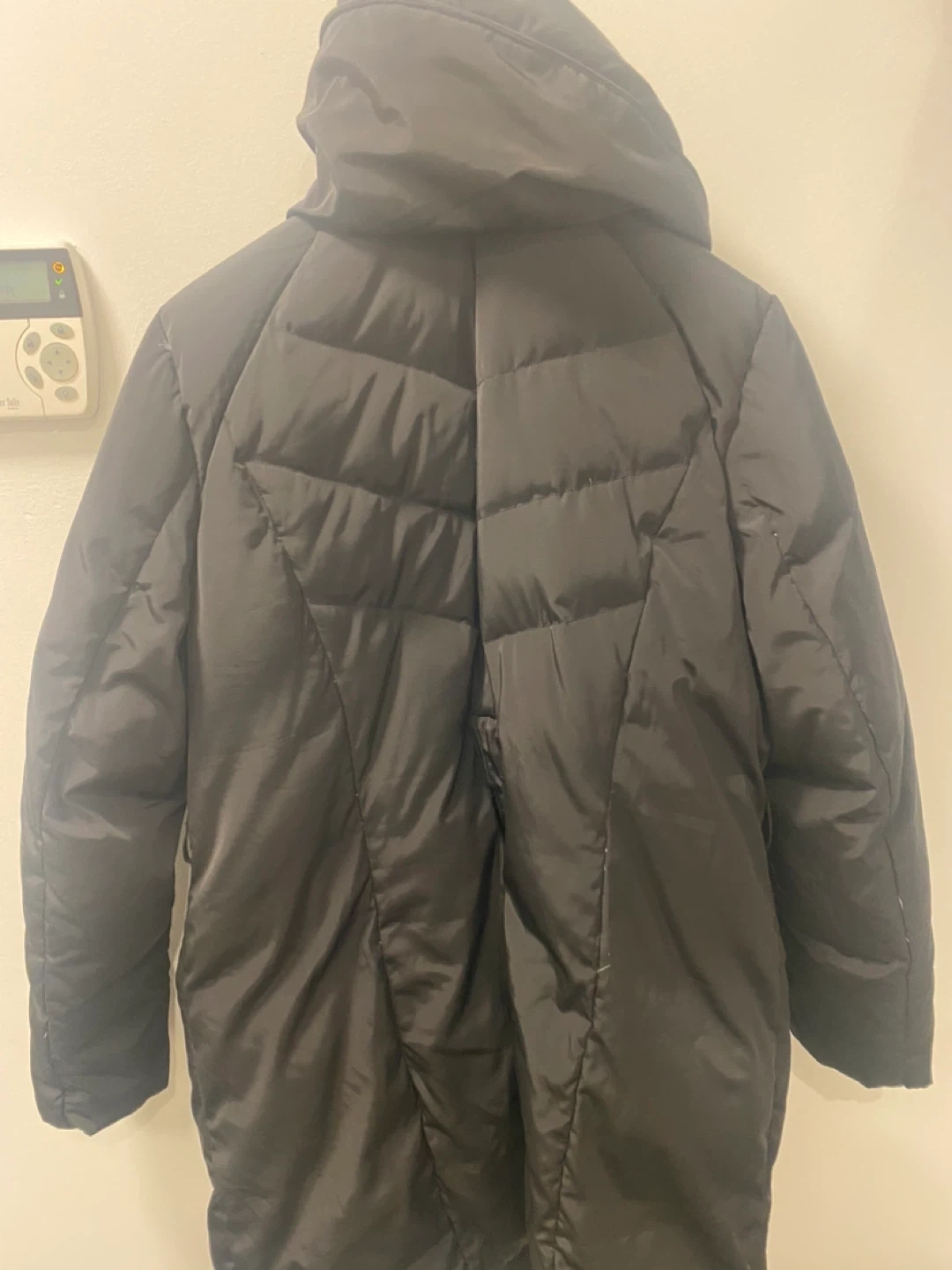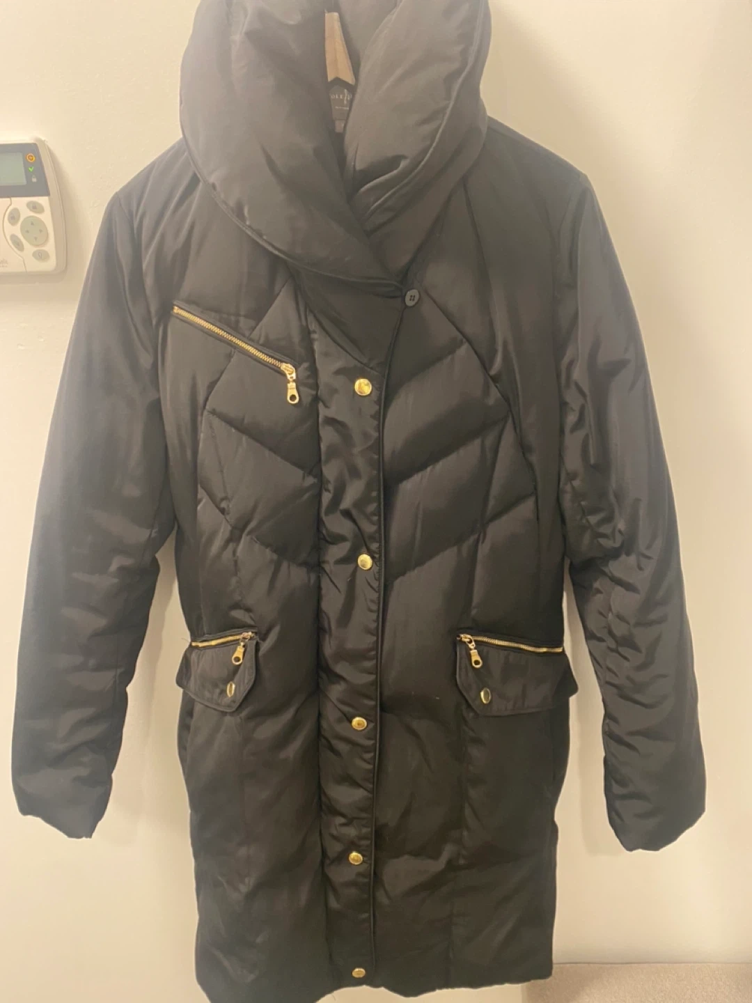 Selling a Cole Haan XL black down-filled coat. It's in great condition and perfect for the Canadian winter. It has a stylish design with gold accents and a high collar to keep you warm and cozy!