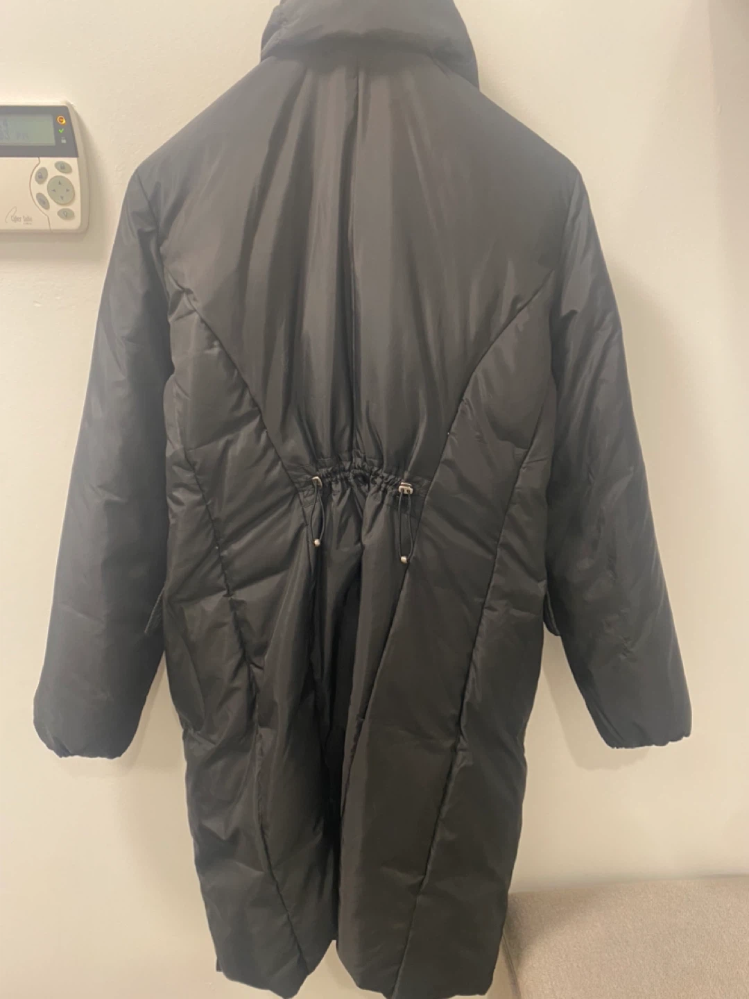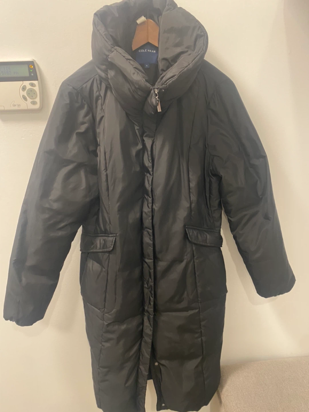 Here's a Cole Haan black down puffer coat in great condition! It's a stylish and warm choice for the colder months.