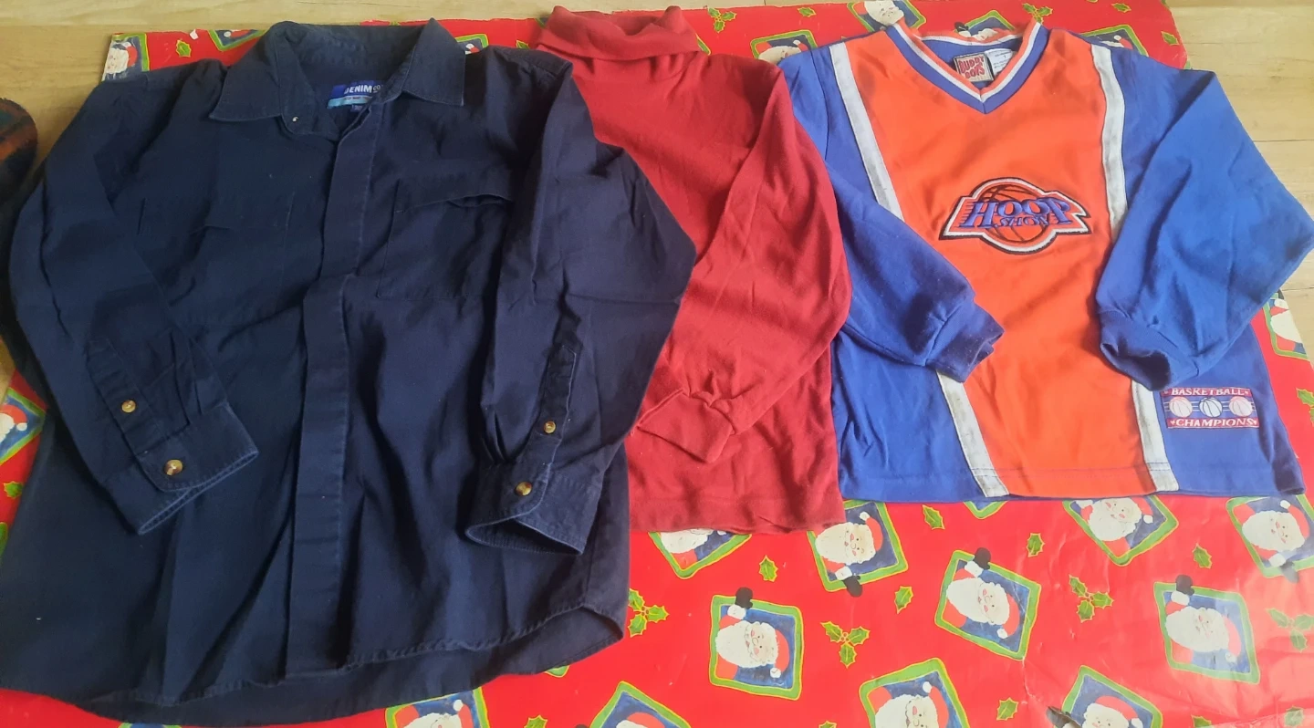 FREE three kids' shirts. One is a navy blue button-down from Jenim Co. The other is a red turtleneck. The third is a blue and orange basketball jersey style shirt with "Hoops Zone" on the front.