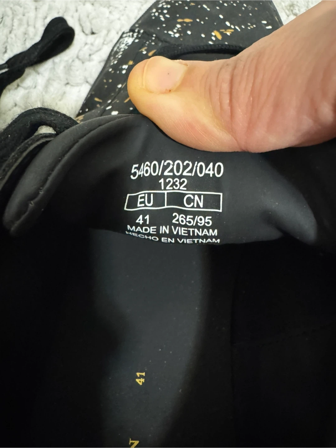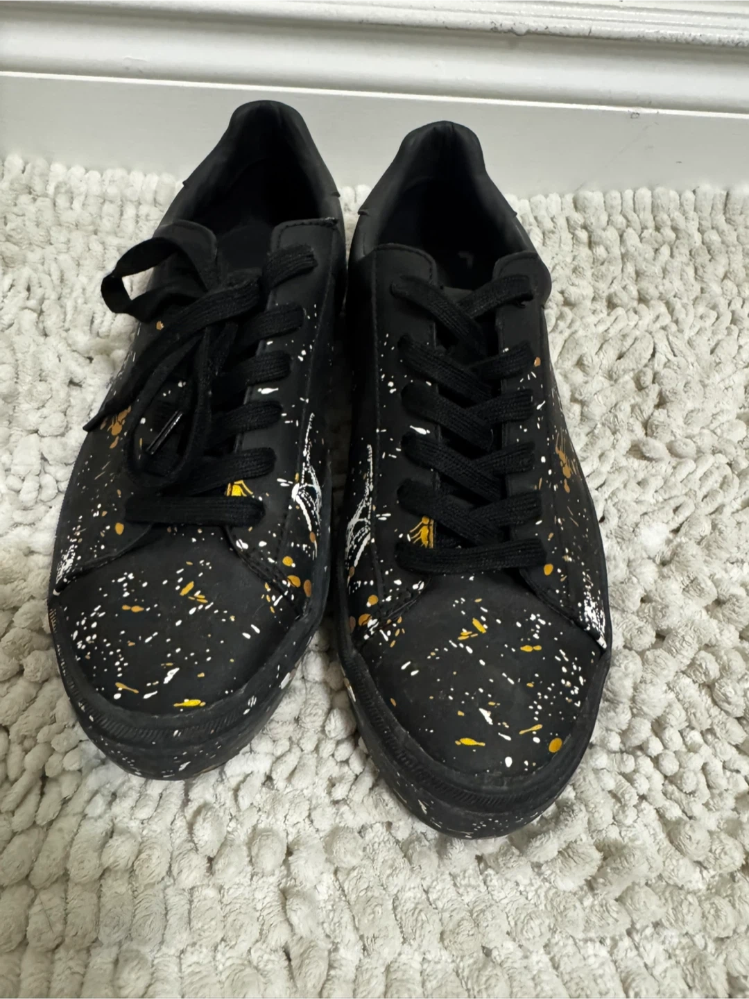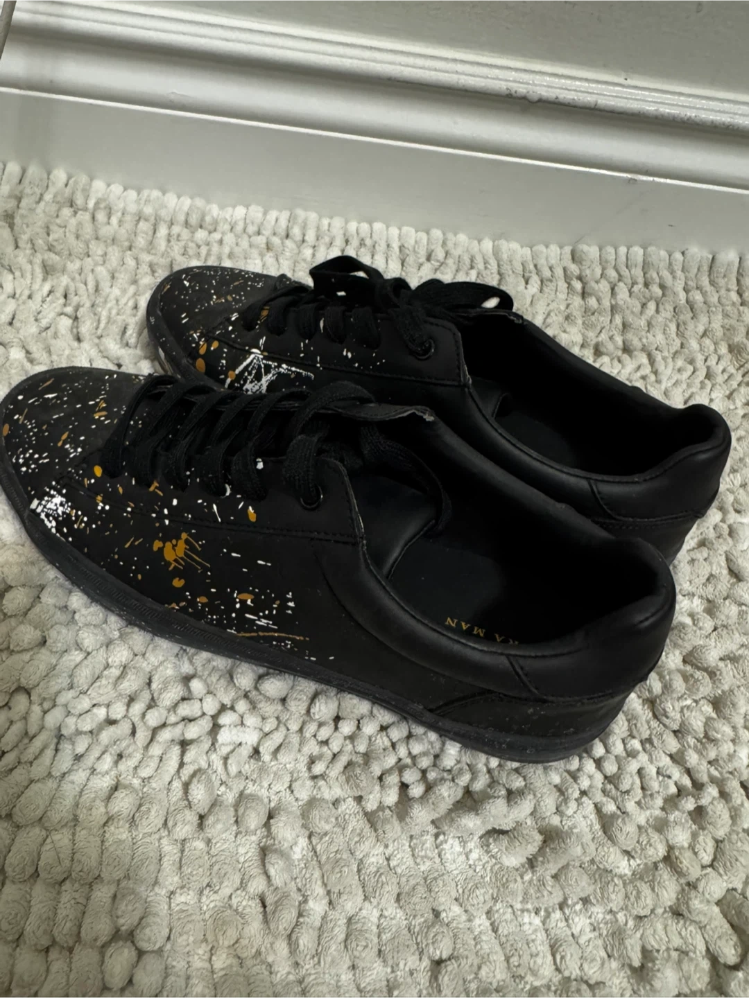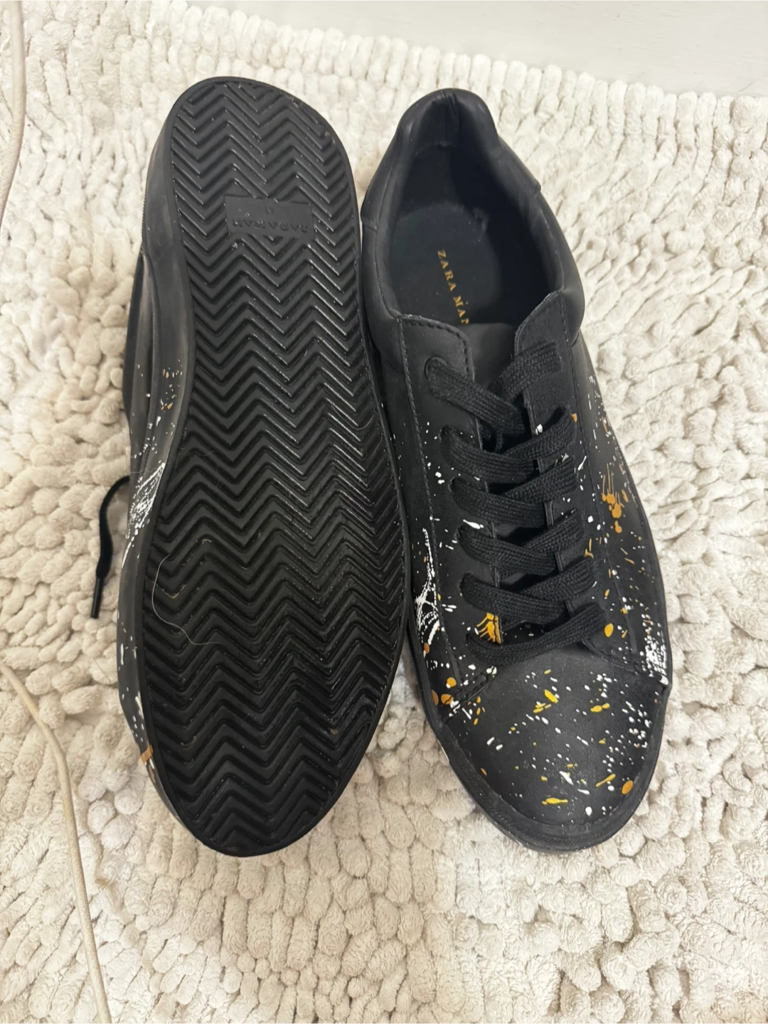 Selling a pair of Zara Man sneakers in black. They feature a unique splatter paint design. The size is EU 41, which is approximately a US size 8. They are in like new condition and ready for a new owner!
