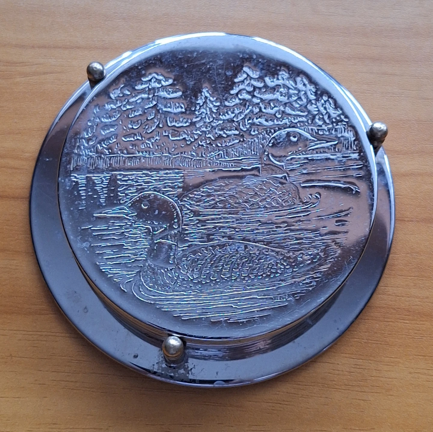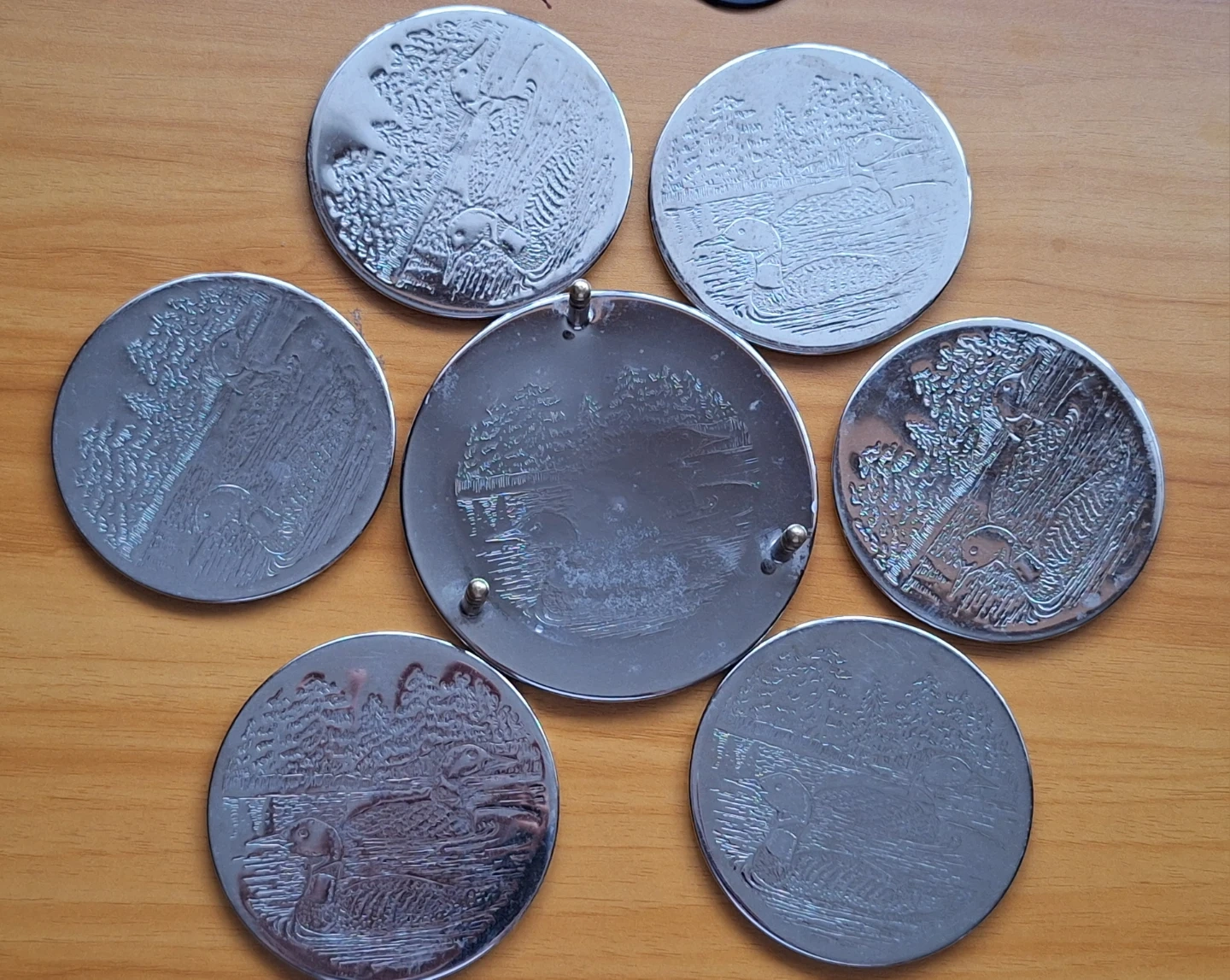 Two sets of vintage silver-plated coasters with stands. One with 4 coasters SOLD and one with 6 coasters (duck motif)