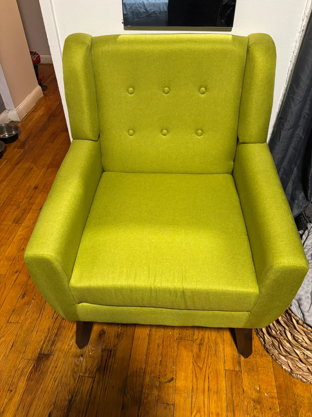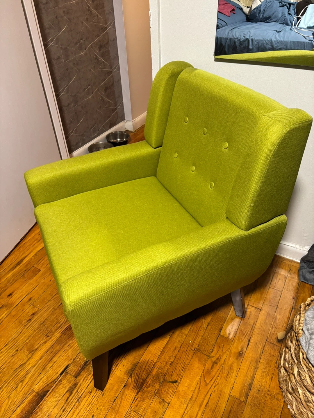 Selling a stylish green accent chair! It's in great condition and would be a lovely addition to any room. The color is a vibrant green, and the material feels durable and comfortable. Perfect for adding a pop of color to your living space