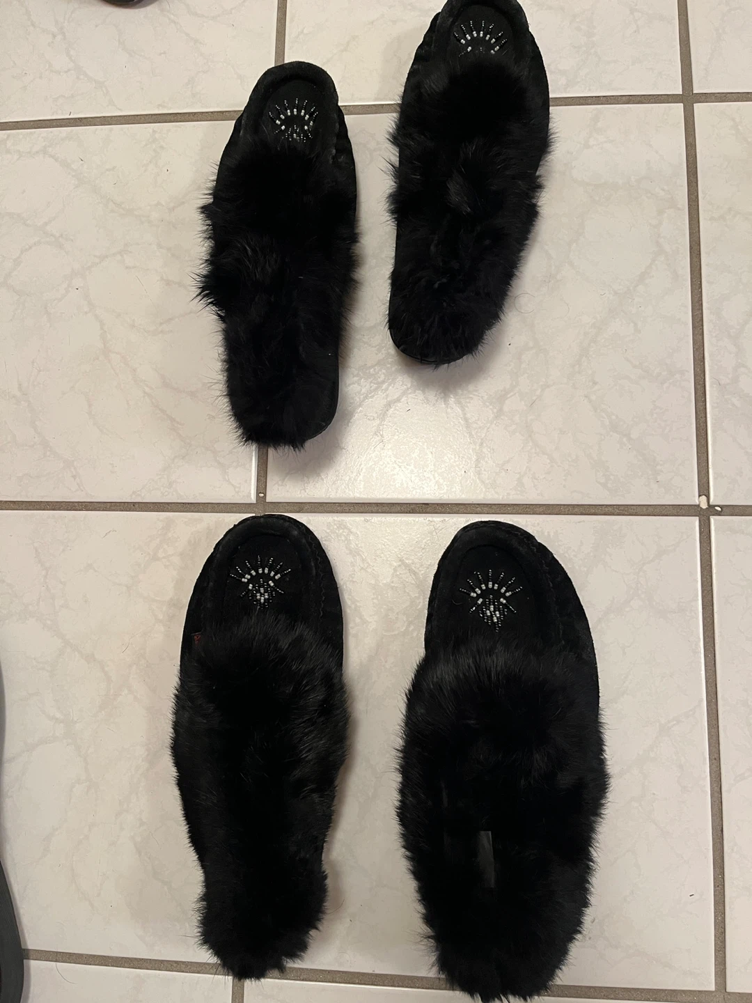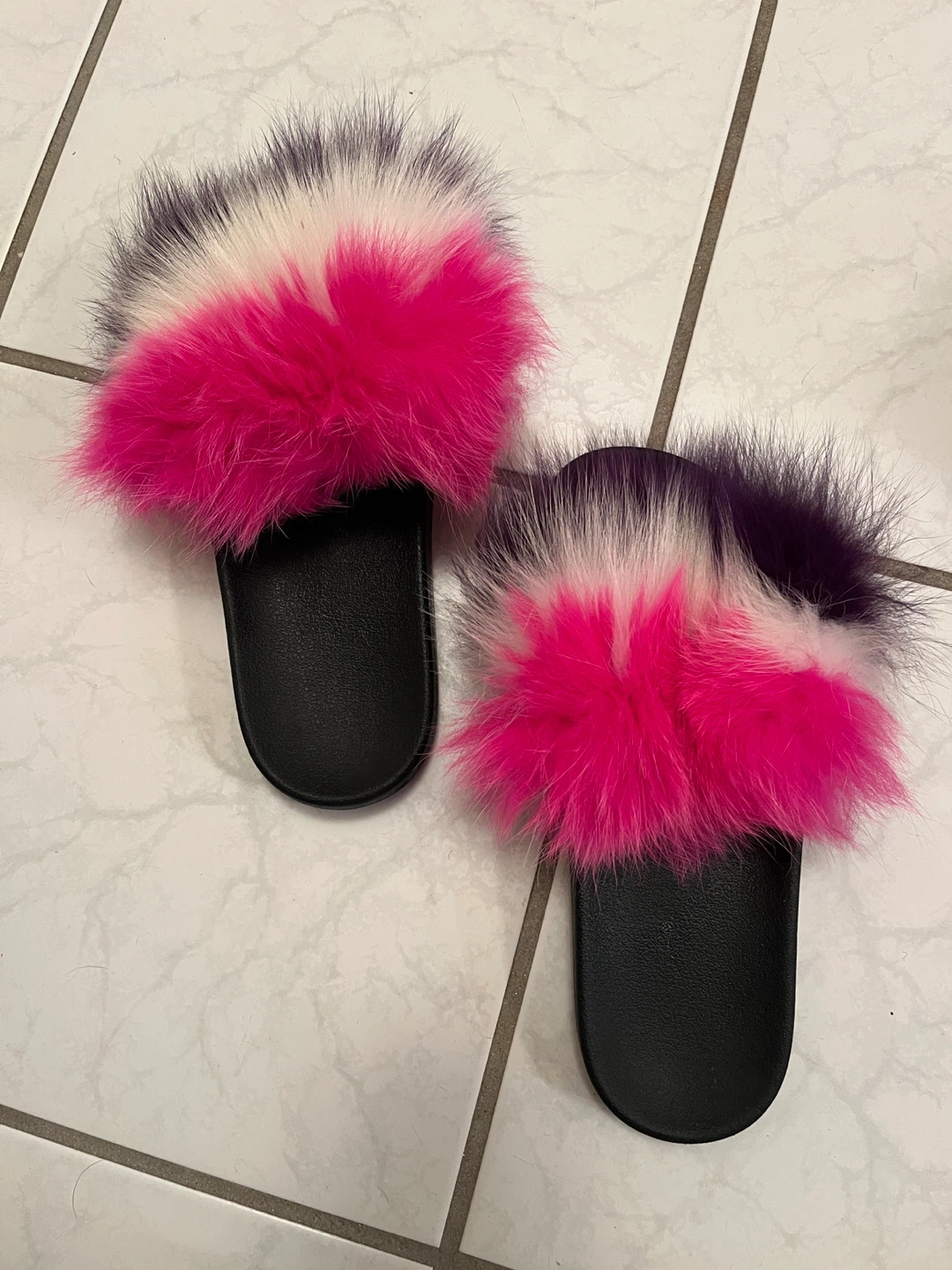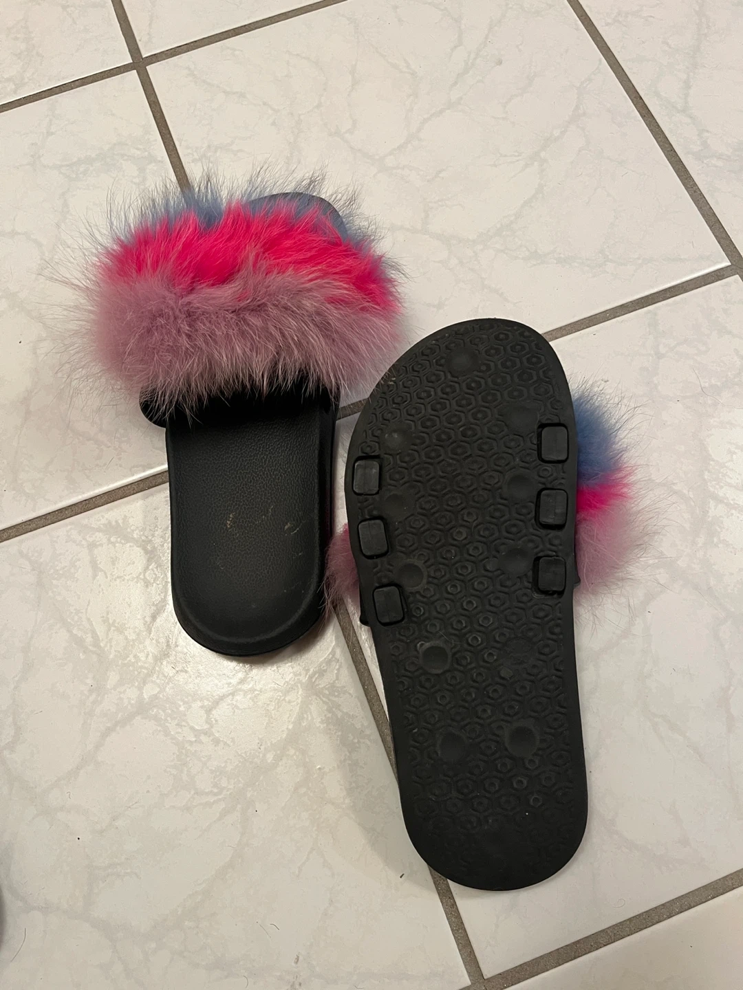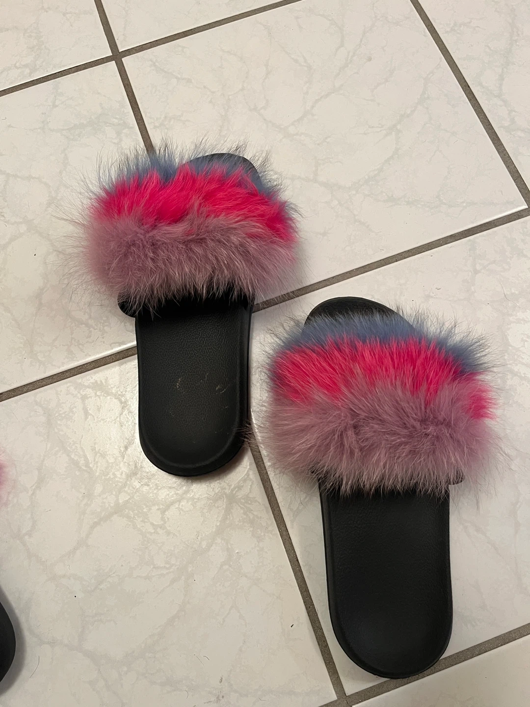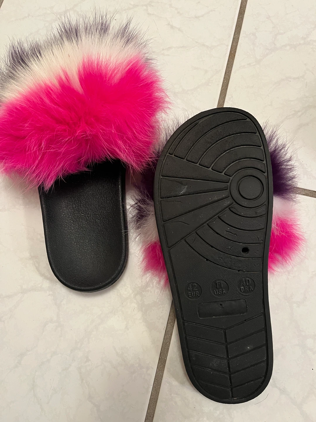 Cute and comfy fuzzy slides! The sole is black and the fur is a mix of grey, white, and pink. The size is 11 USA.