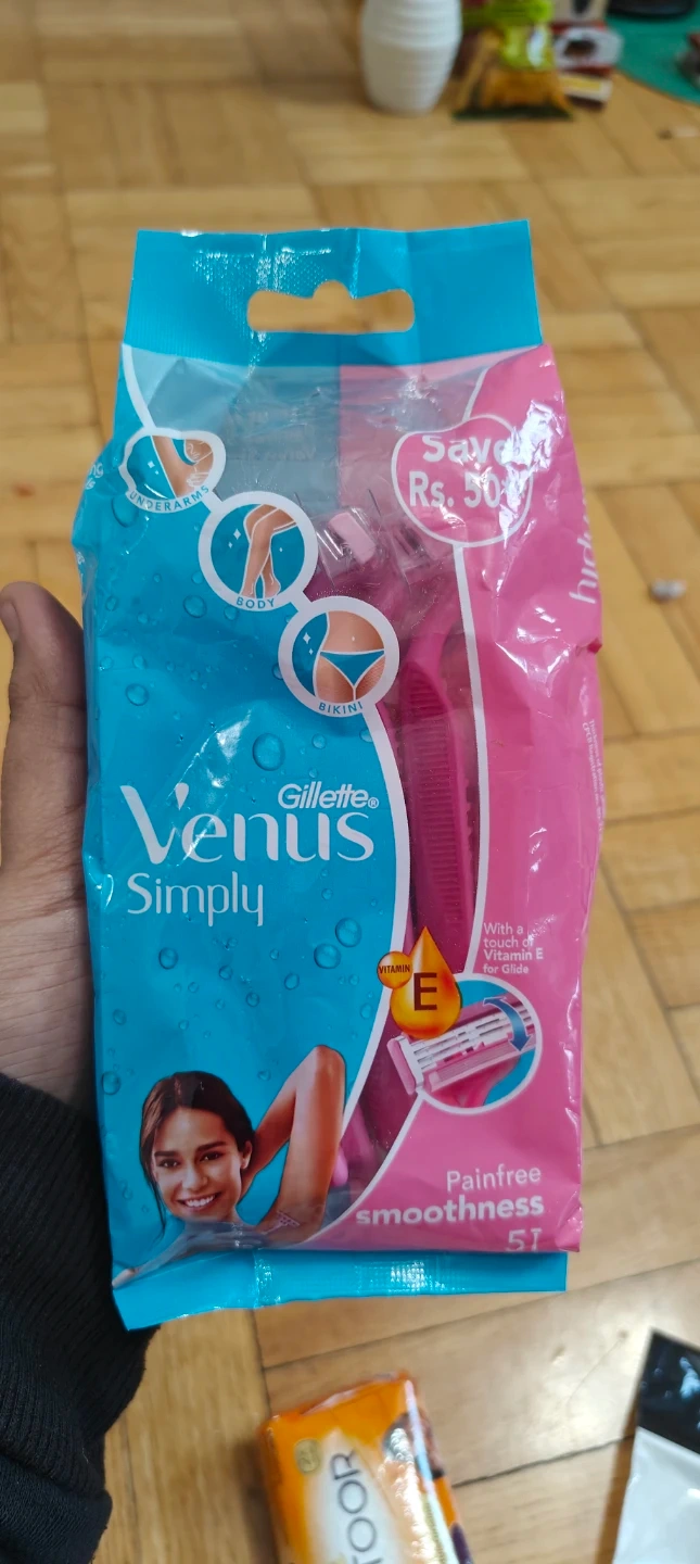 Selling a pack of Gillette Venus Simply3 razors! This pack contains 5 razors, perfect for underarms, body, and bikini area. They provide a pain-free smoothness with Vitamin E for your skin. Glide smoothly against hair growth and keep your skin moisturized and shiny!
