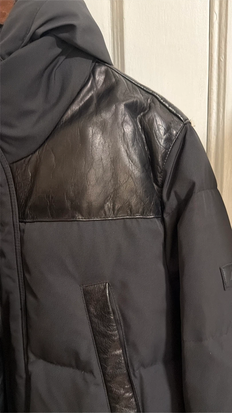 Features premium leather detailing on the shoulders and pockets, giving it a modern, elevated look.