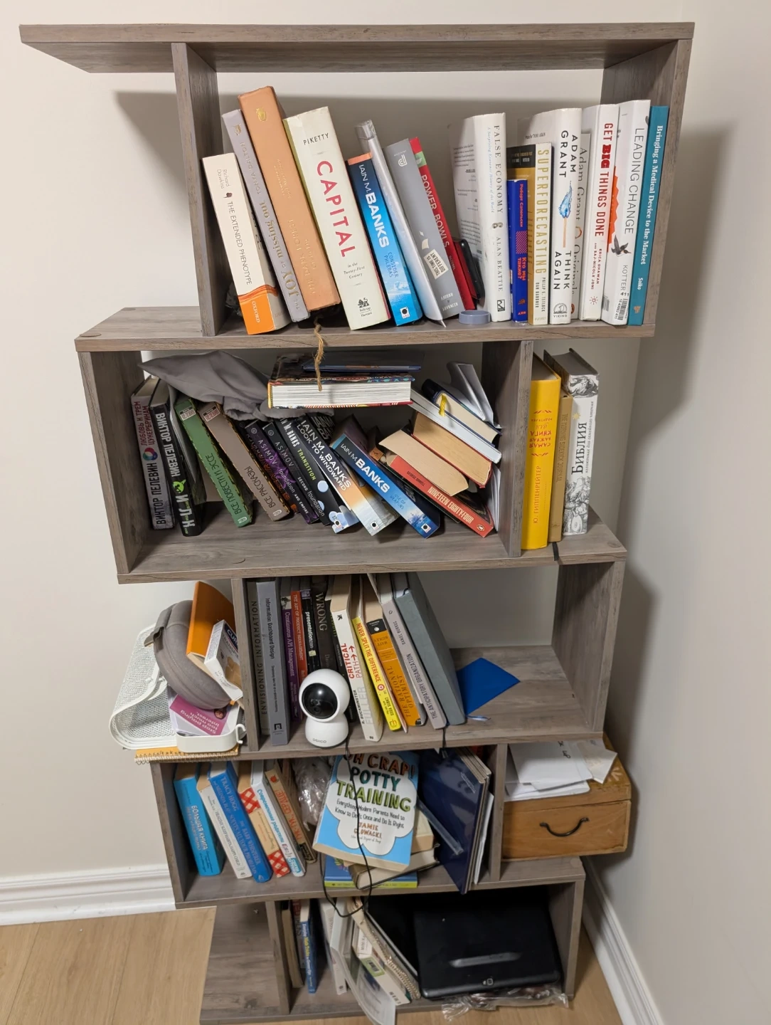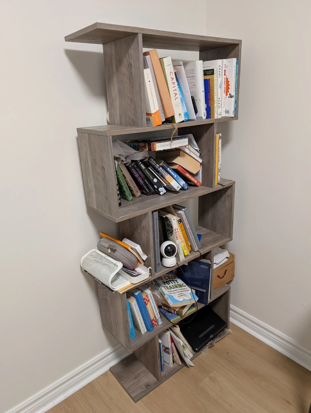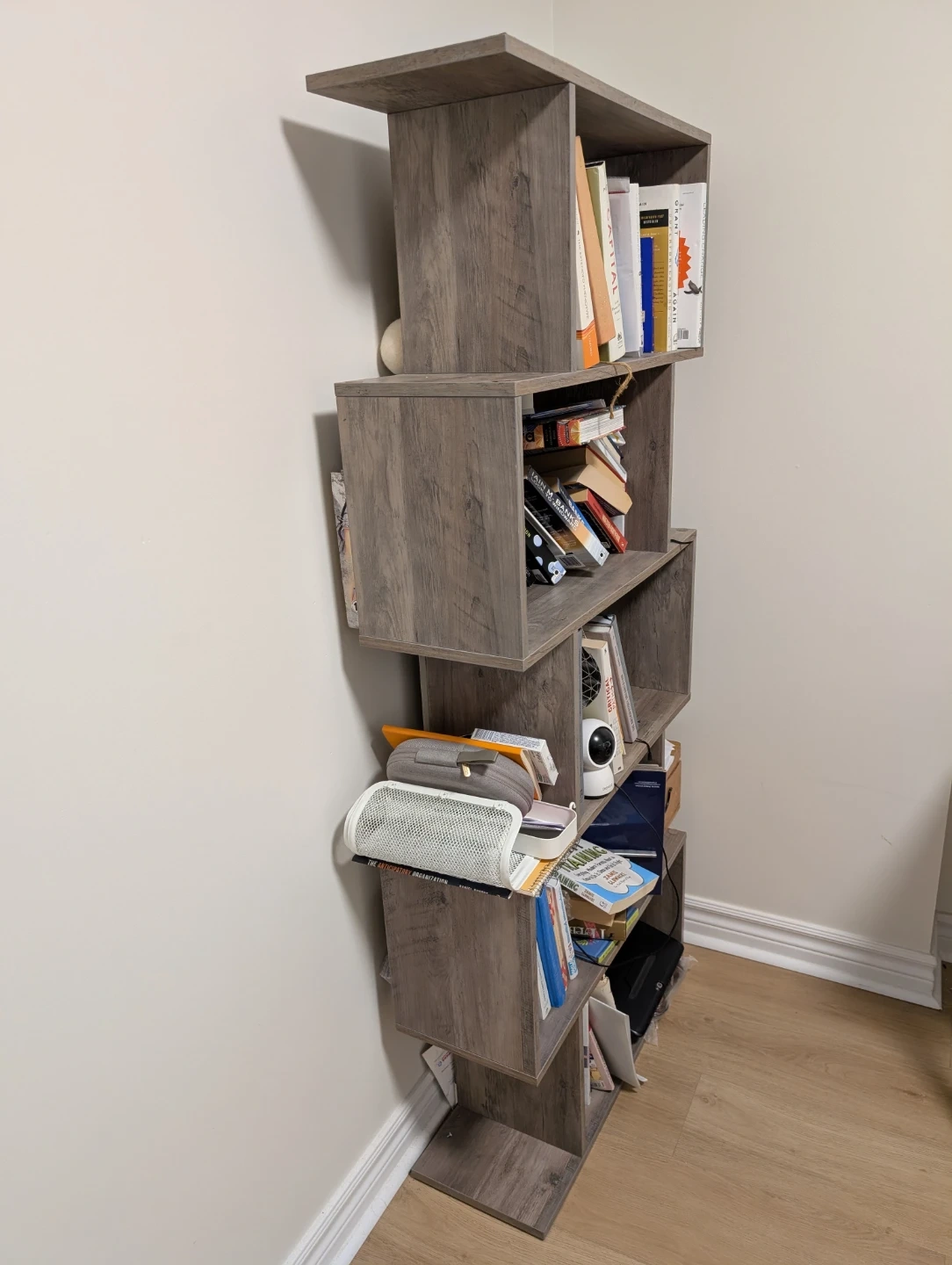 Selling a grey wooden bookshelf. It's in great condition and ready to hold your favourite books or display your cherished items. It has a unique design that will add a touch of style to any room