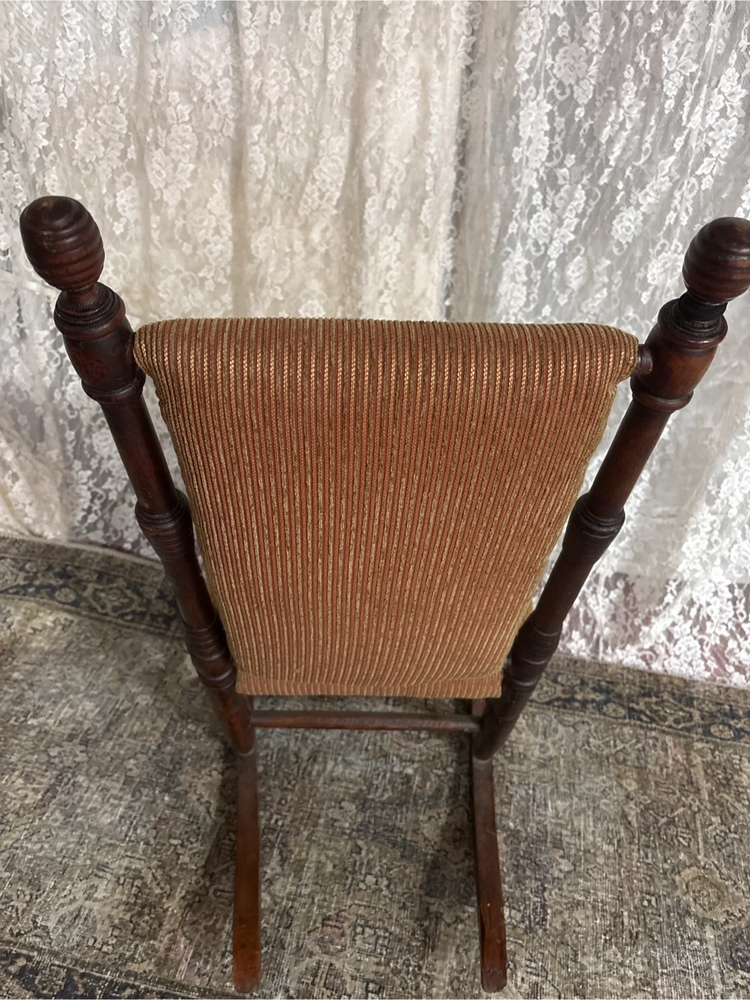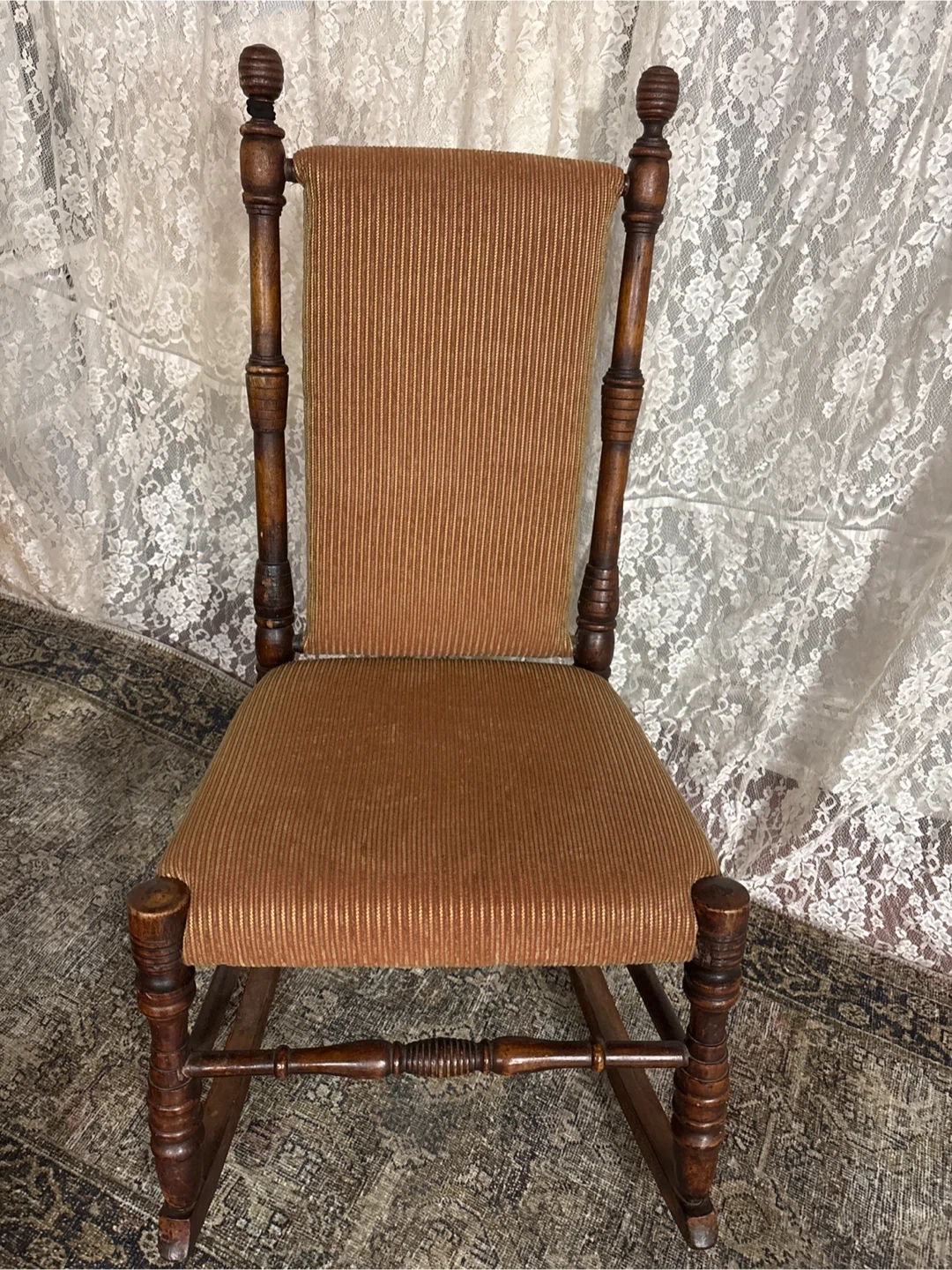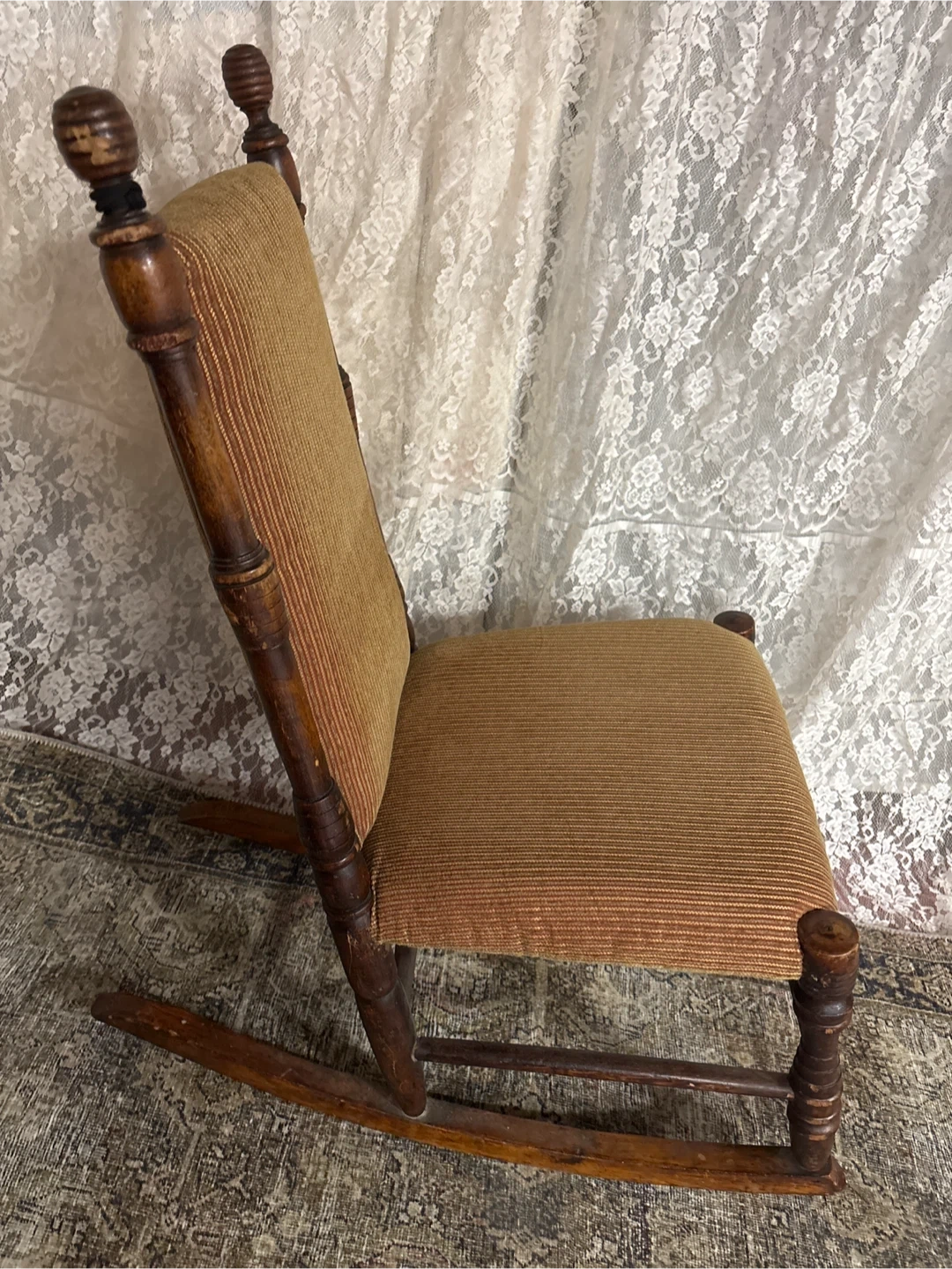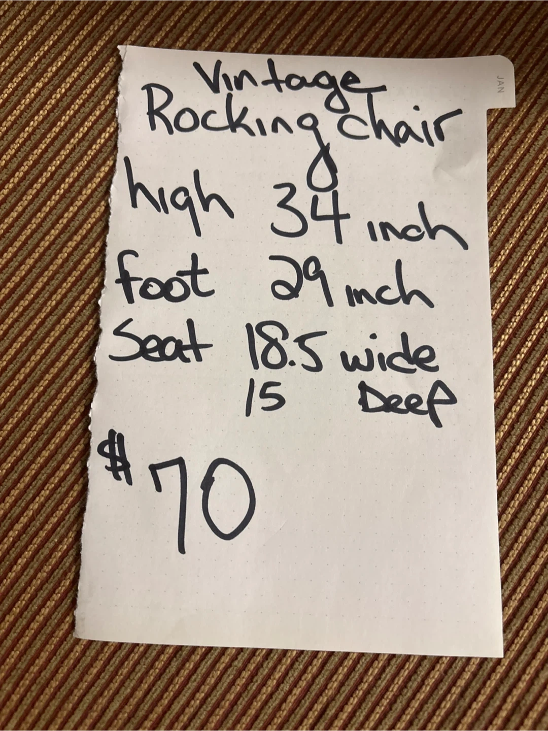 I'm selling a vintage rocking chair. It's 34 inches high, the foot measures 29 inches, and the seat is 18.5 inches wide and 15 inches deep. $70