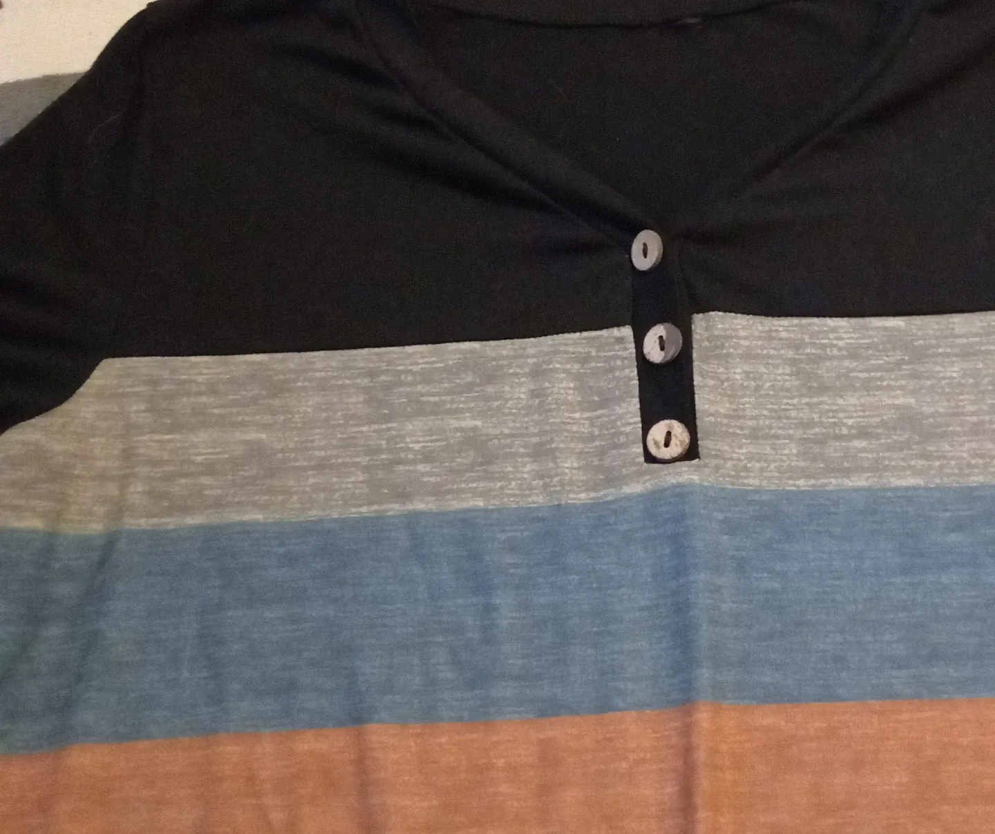 Selling a cute striped short sleeve top! It features a black top portion with stripes of grey, blue, and brown. Perfect for a casual look. CASH ONLY