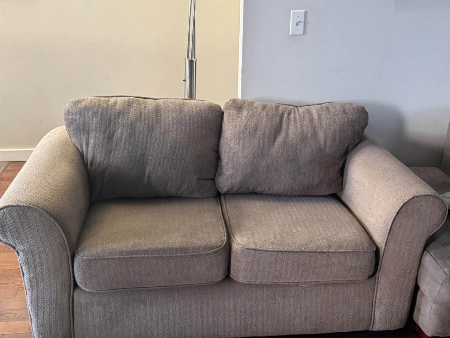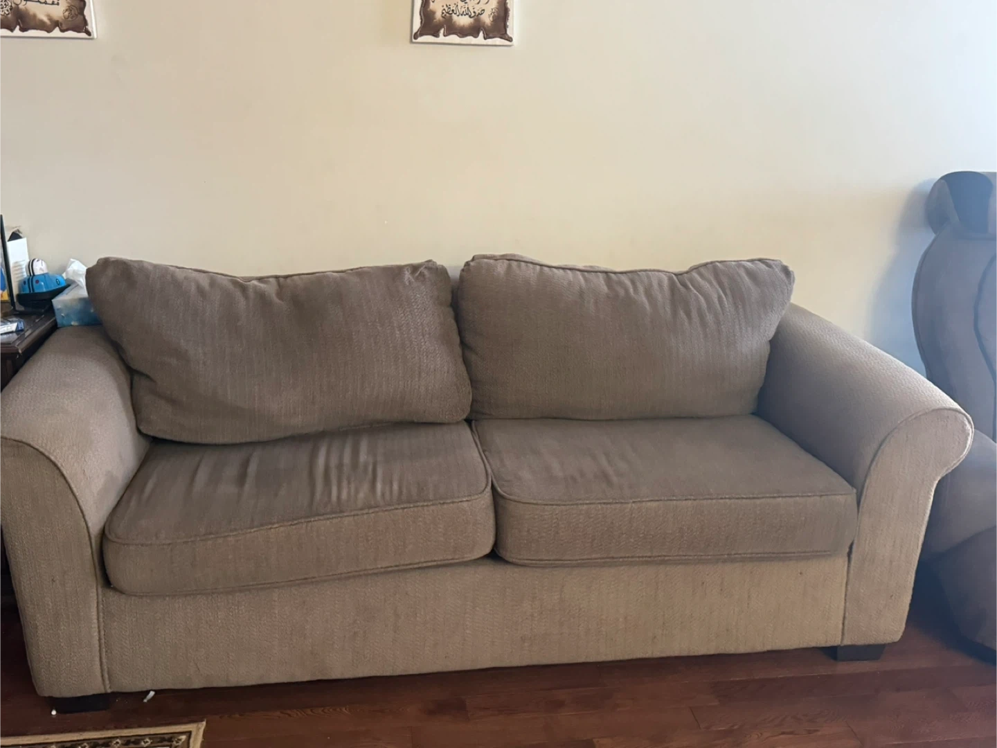 Selling a comfy loveseat sofa! It's in good condition and perfect for a small space. The colour is a neutral beige/tan, so it will match most decor.
