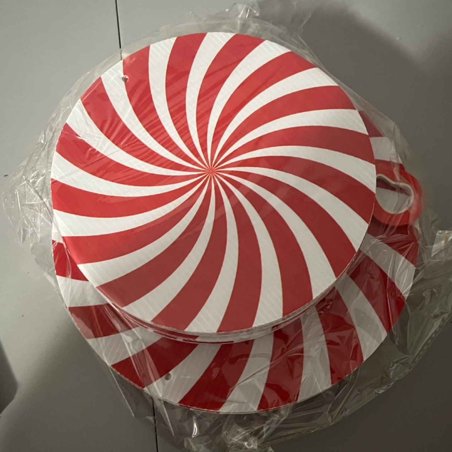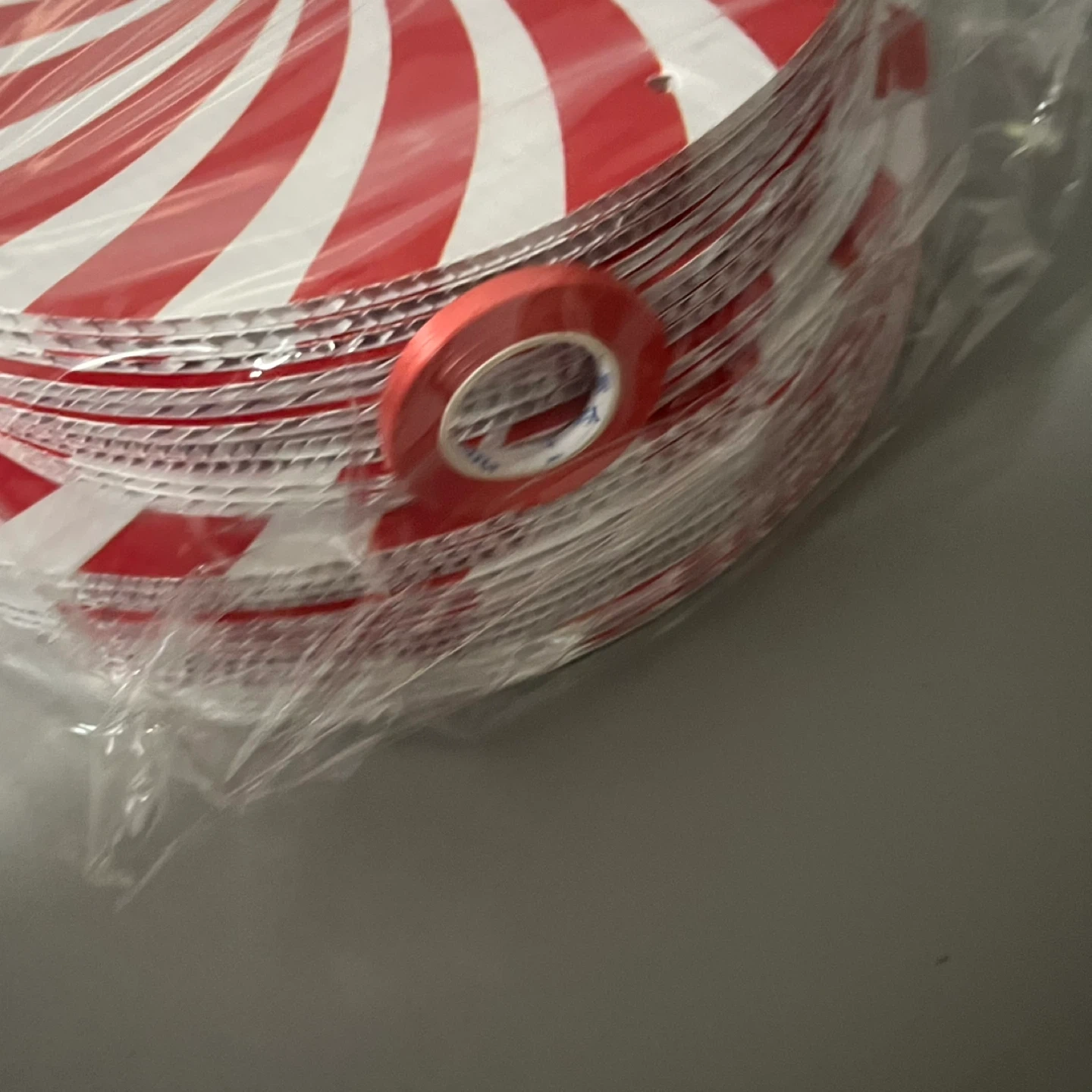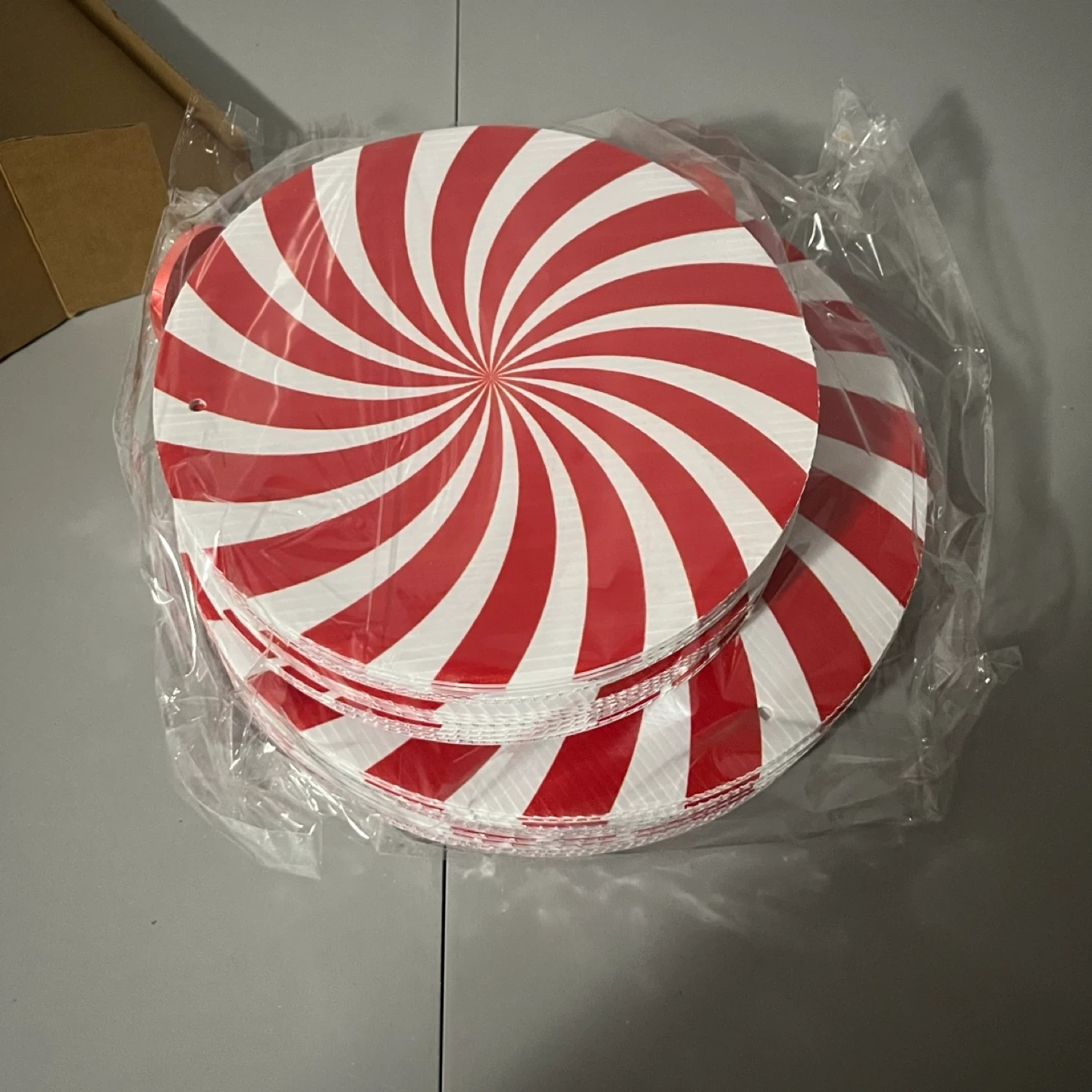 I'm selling a stack of red and white swirl paper plates. They are still sealed in the original packaging and are brand new!