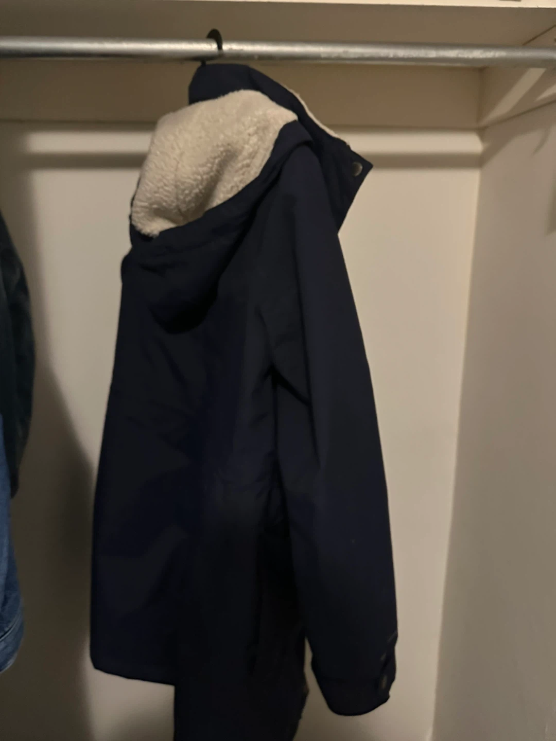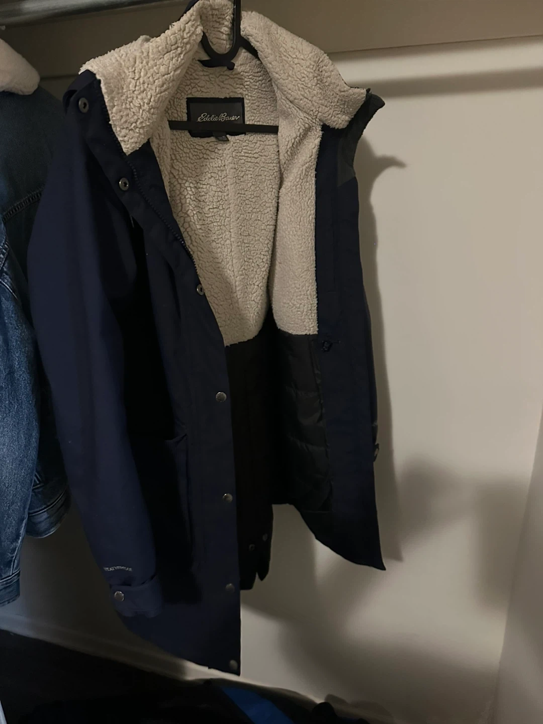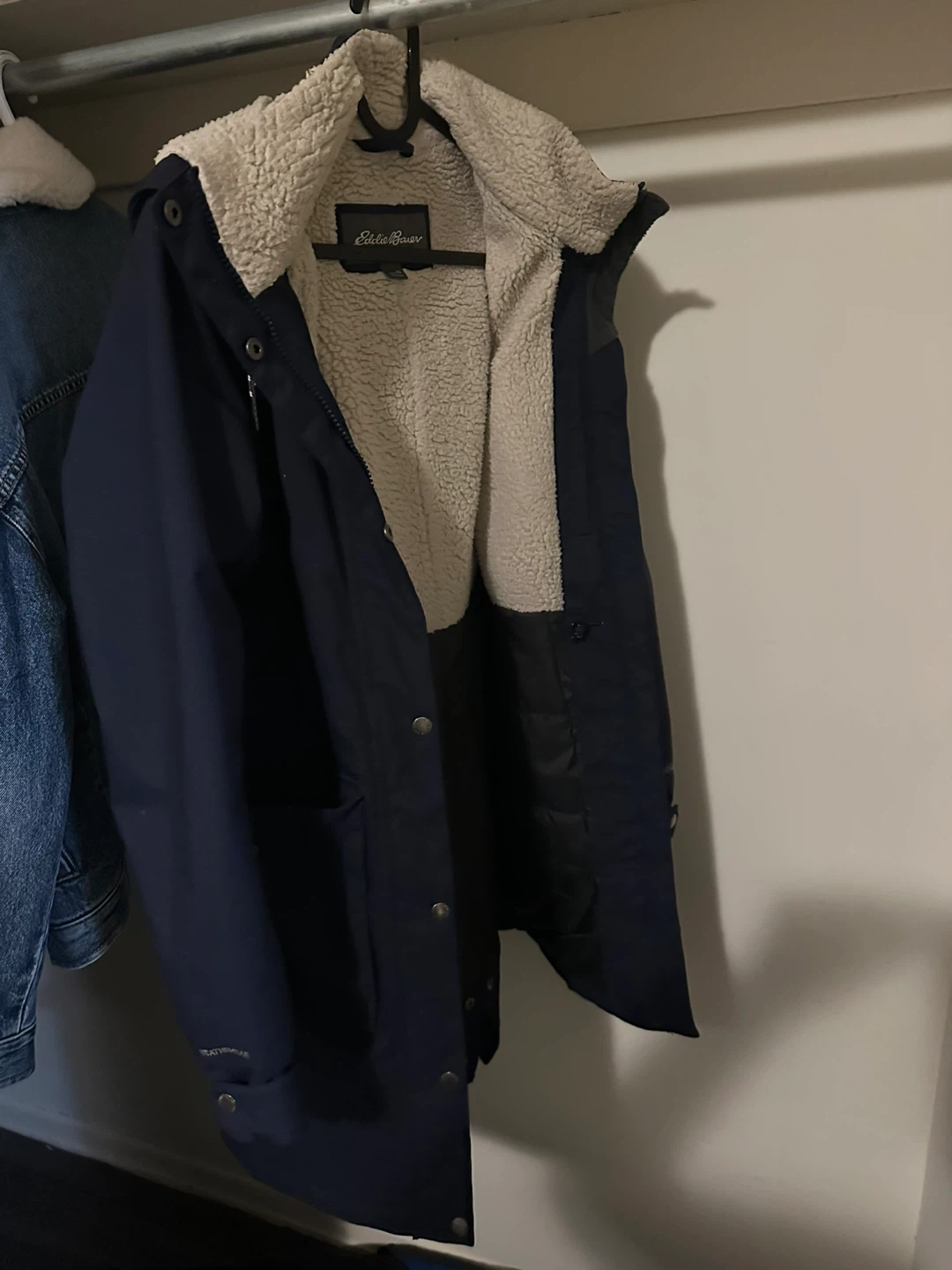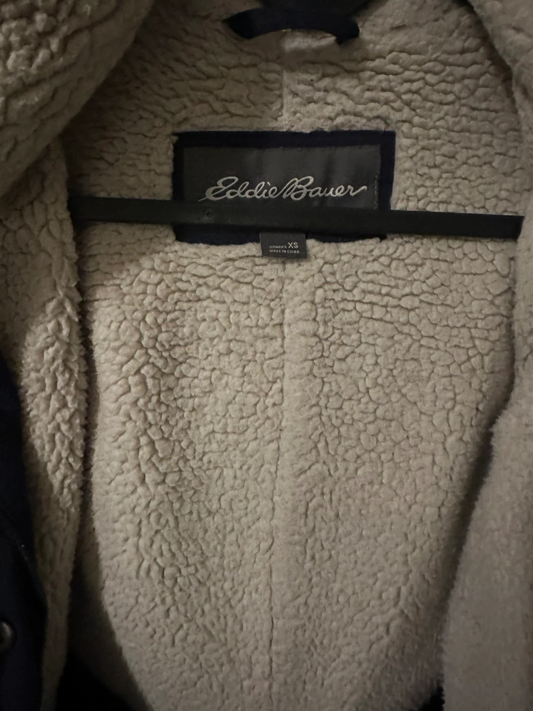 Eddie Bauer coat, size XS in navy blue. It's sherpa-lined to keep you warm and cozy!