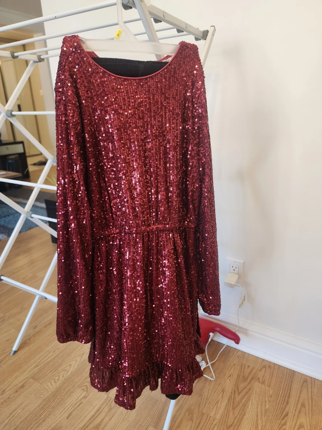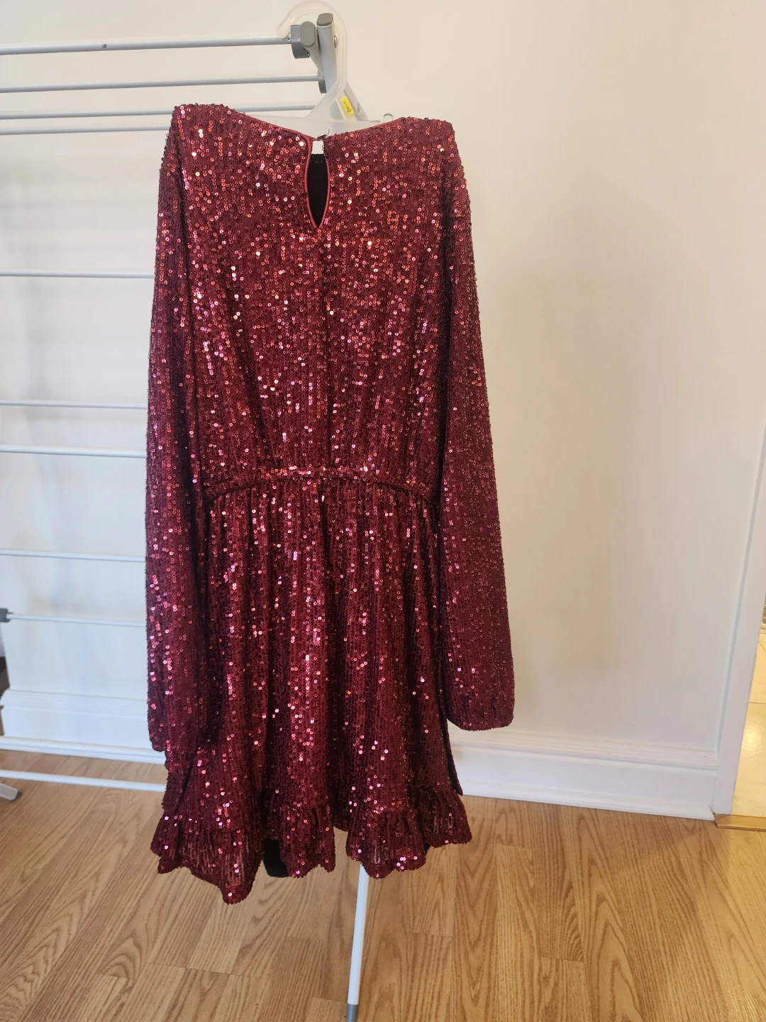 Here's a beautiful burgundy sequin dress! It features long sleeves and a ruffled hem. Perfect for a night out or a special occasion