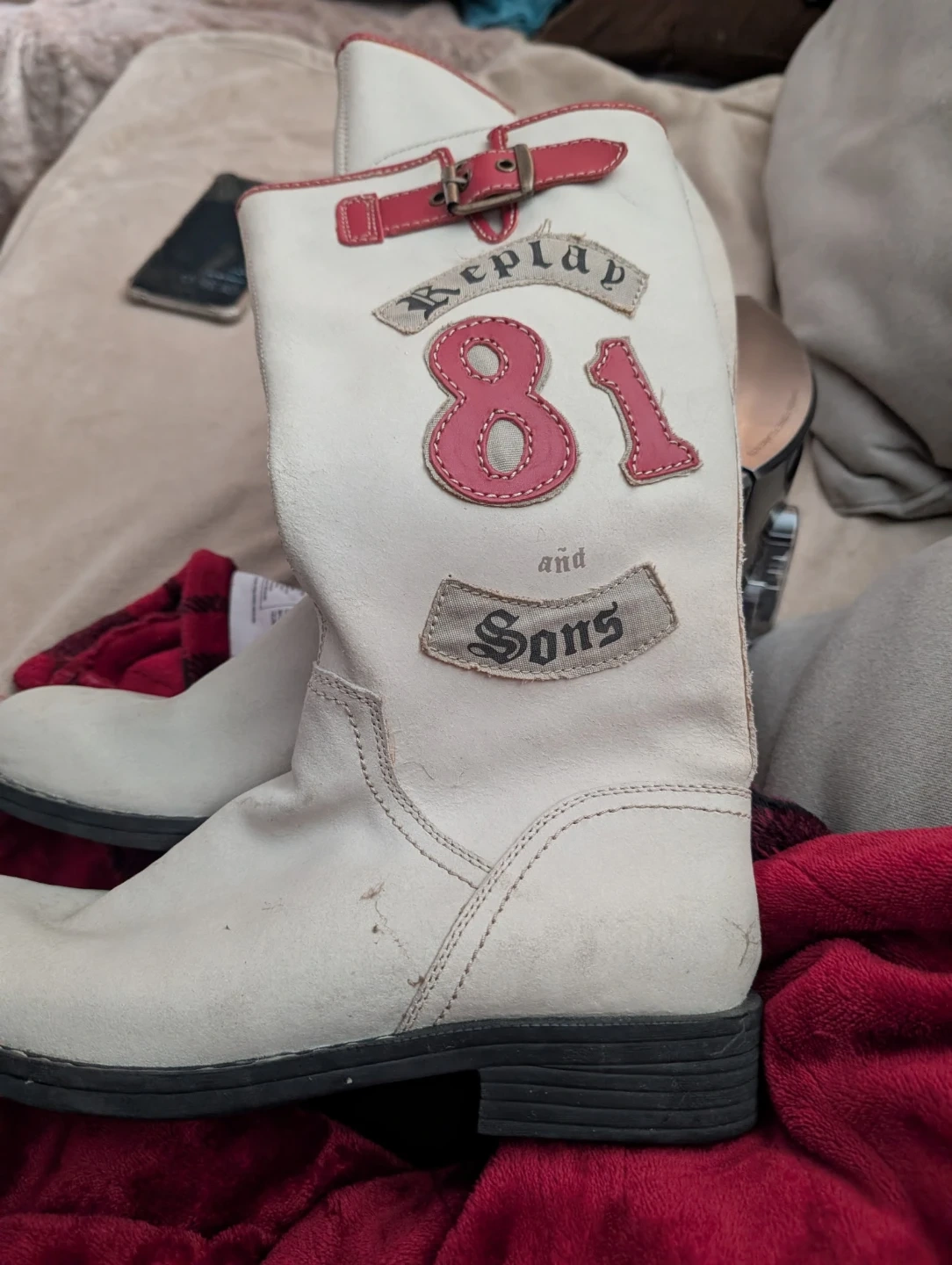 Selling a pair of Replay & Sons genuine leather boots. They are white with red accents. They are brand new never been worn just to try on. Size 9