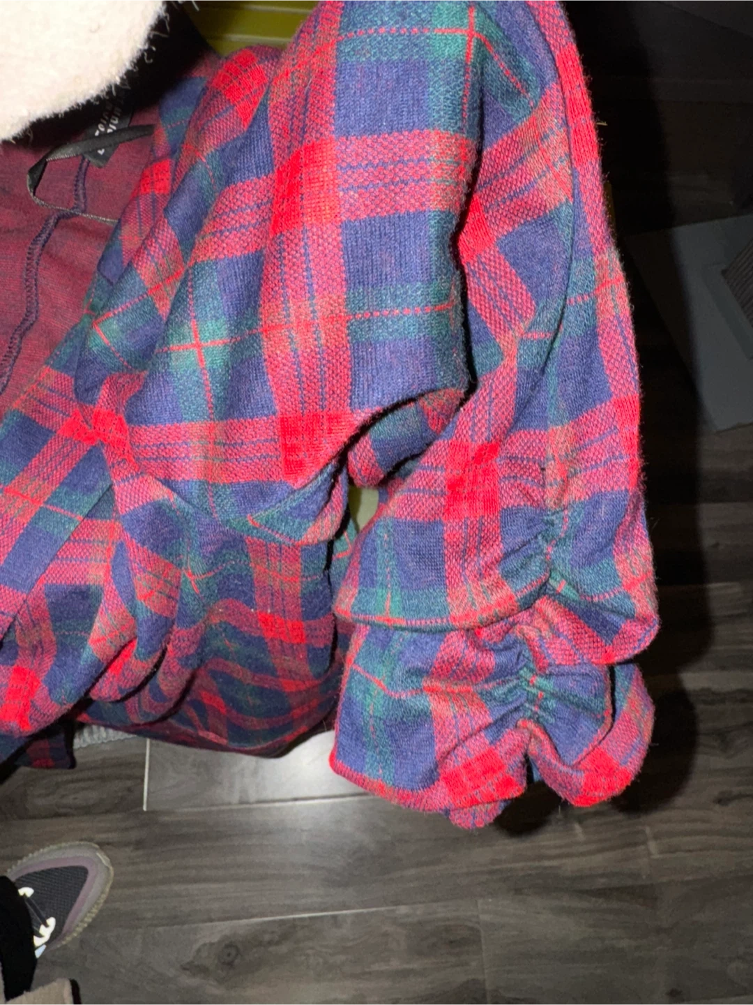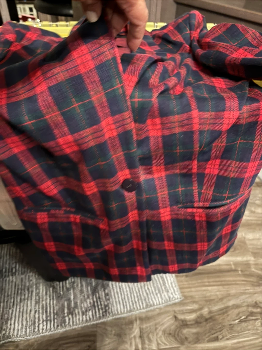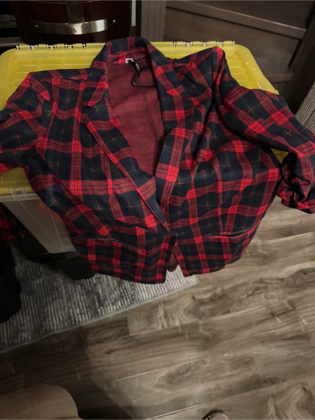 Here's a stylish plaid blazer from Lab Design Victoria. It's a size small and features a classic red, blue, and green plaid pattern. Perfect for adding a pop of colour to your wardrobe for the holidays!
