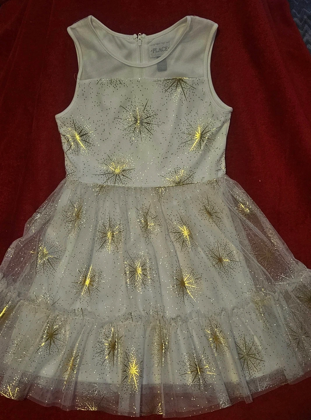 This cute dress features a white bodice and layered skirt with gold star accents! It's in great condition and perfect for parties or special occasions