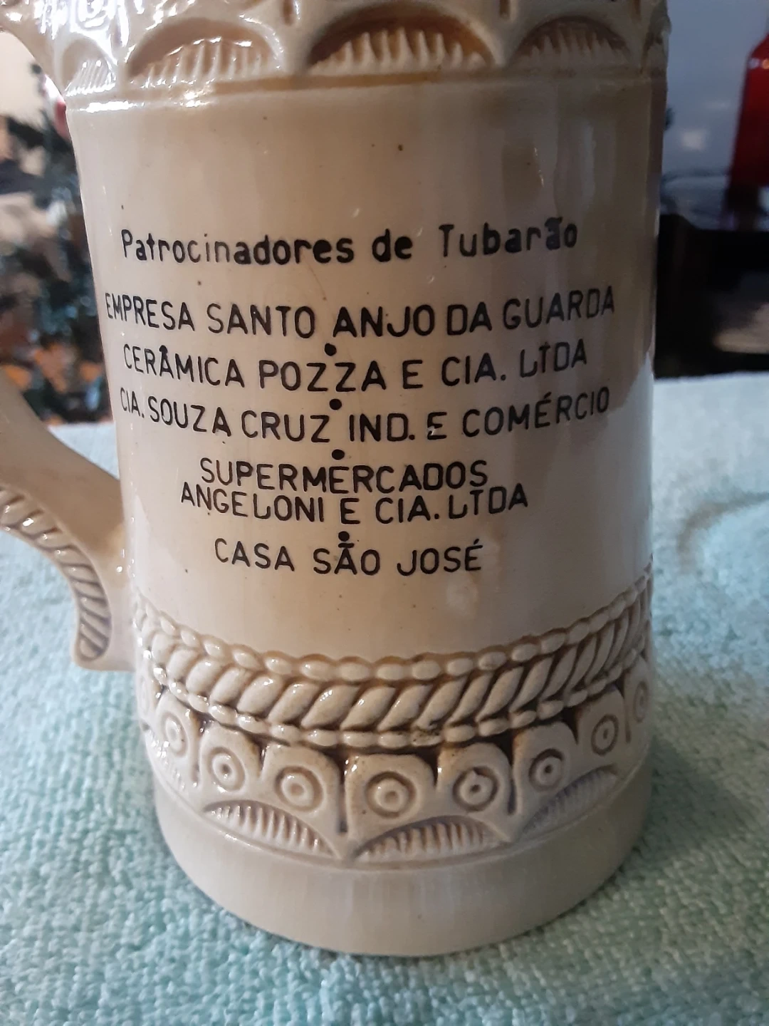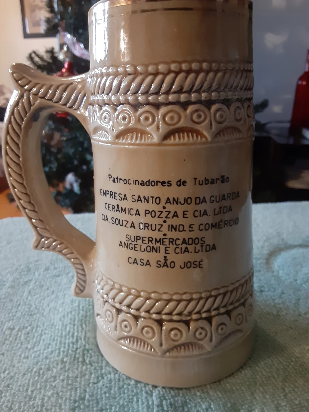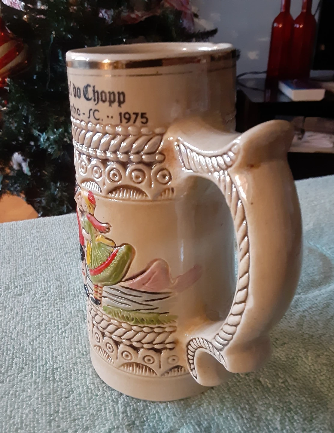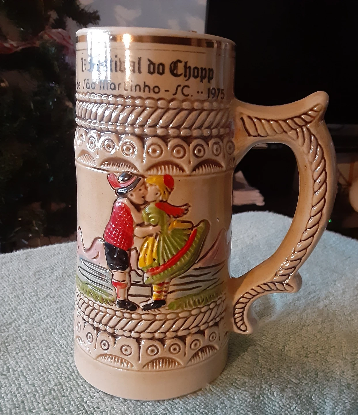 Selling a vintage beer stein from Cerâmica São Joaquim. It commemorates the '1º Festival do Chopp de São Martinho-SC' from 1975. The stein features a decorative design with a couple and intricate detailing around the top and base. A unique piece for collectors!