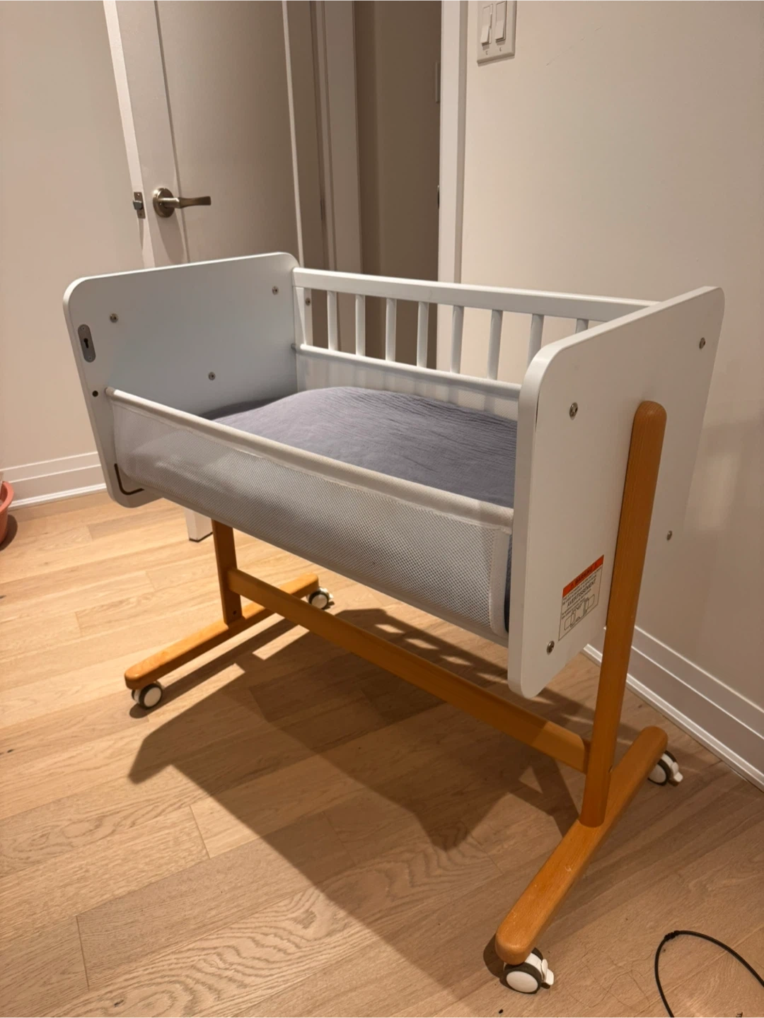 Selling a gently used baby bassinet in great condition! It's white with a wooden frame and has wheels for easy movement. Perfect for a newborn!