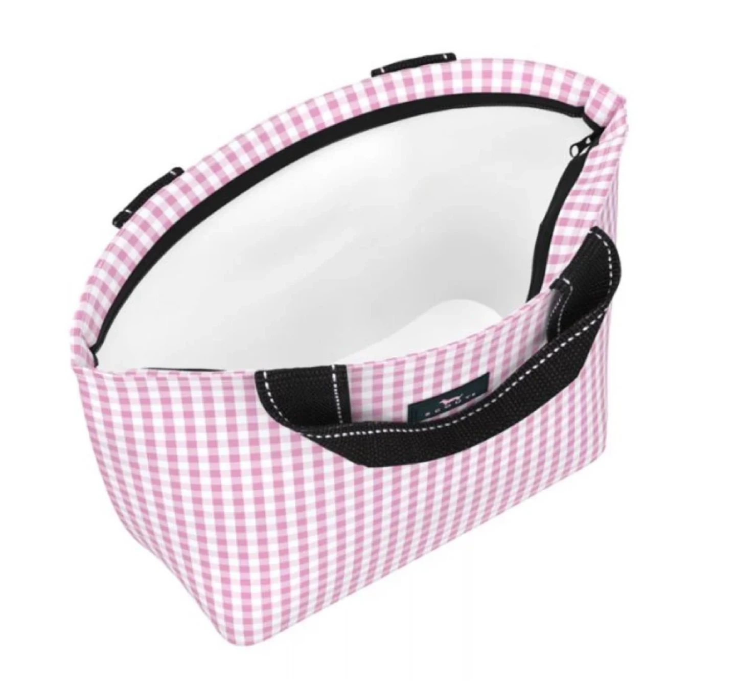 This Scout Nooner Lunch Box is perfect for keeping your lunch cool and stylish! It features a cute pink gingham pattern and black handles. Great for school, work, or picnics!