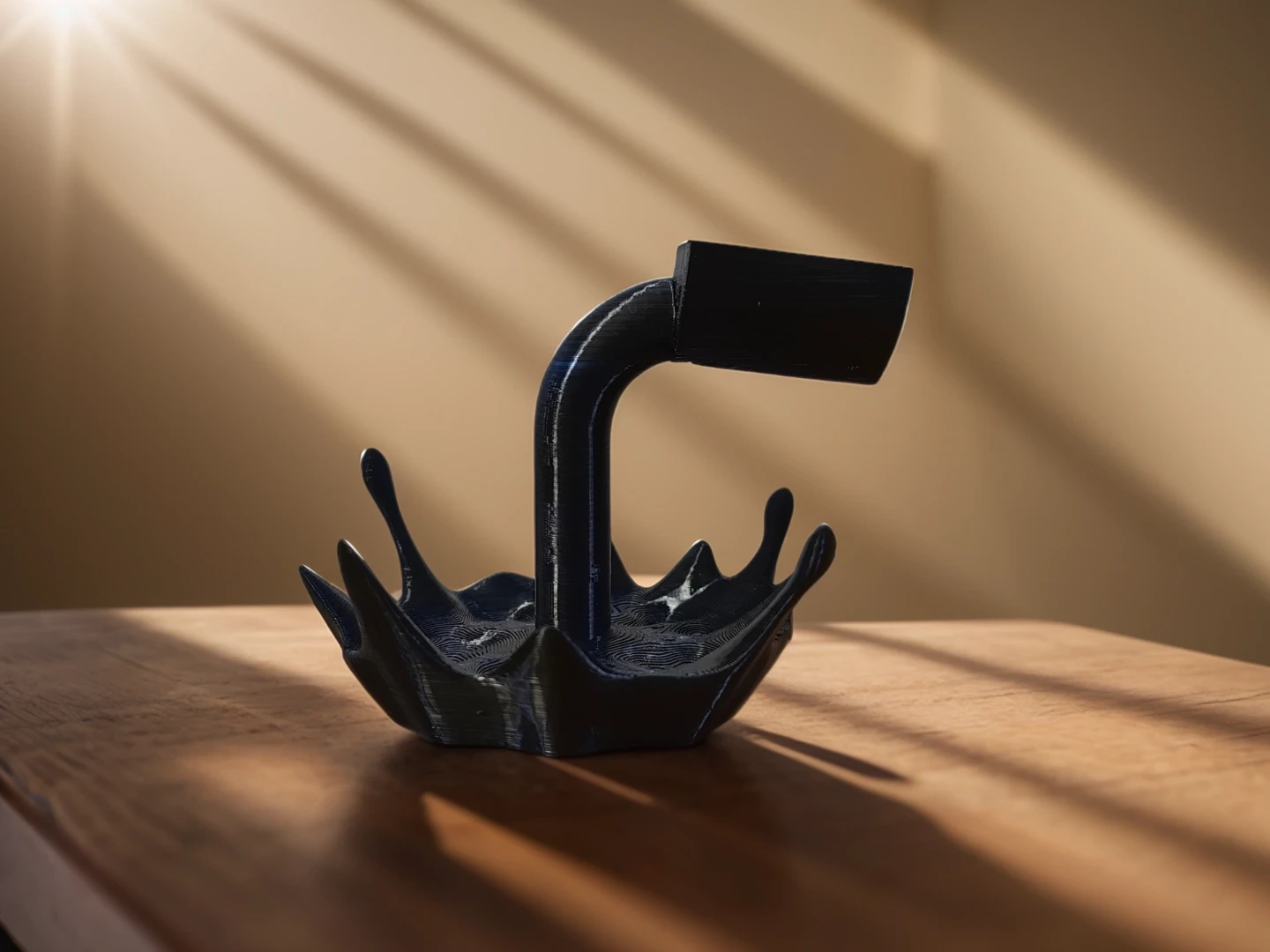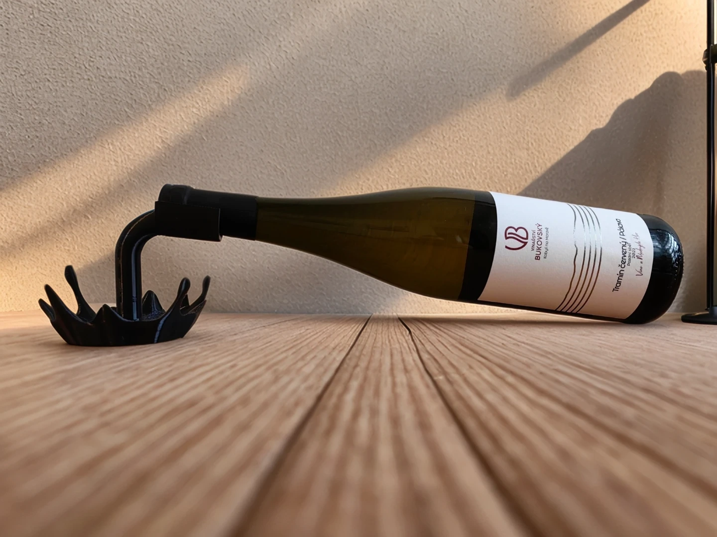 I'm selling a unique black wine bottle holder. It's a stylish and functional piece to display your favourite wine bottle. It's in great condition and ready to add a touch of elegance to your home decor