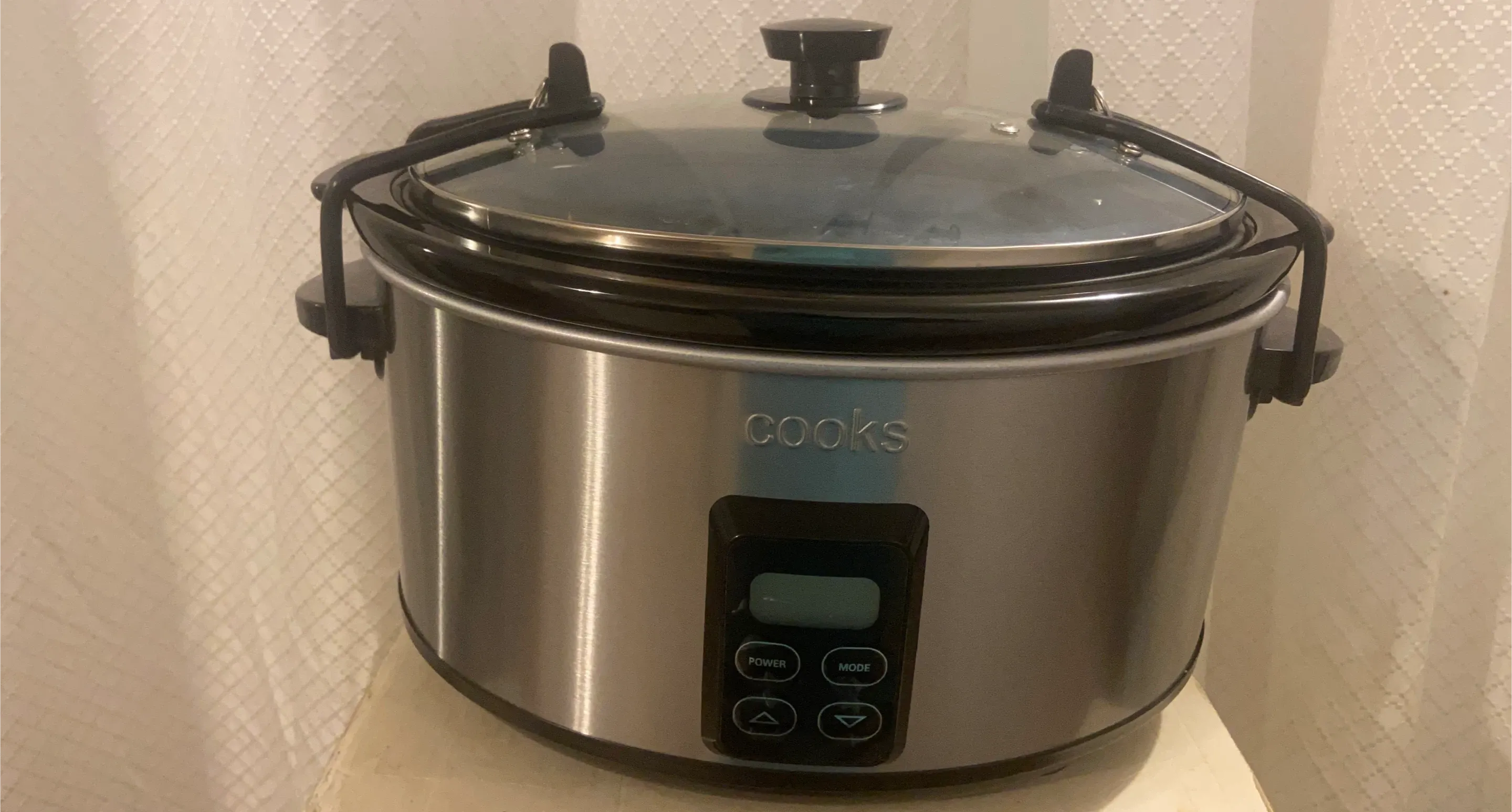 Cooks slow cooker in great condition! It features a power and mode button, and a glass lid to see your food while it's cooking
