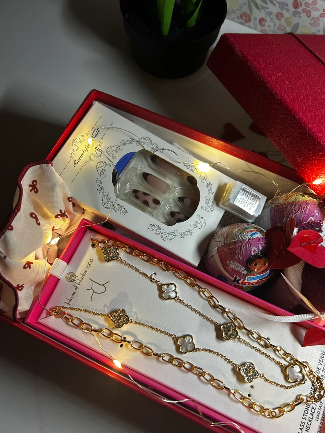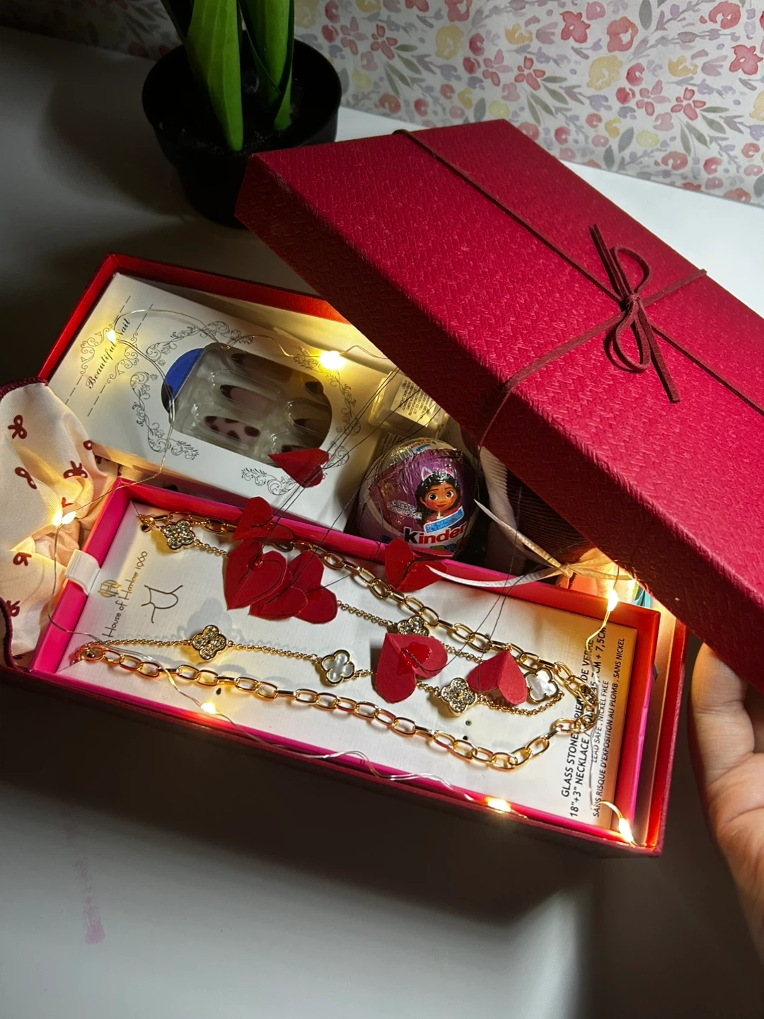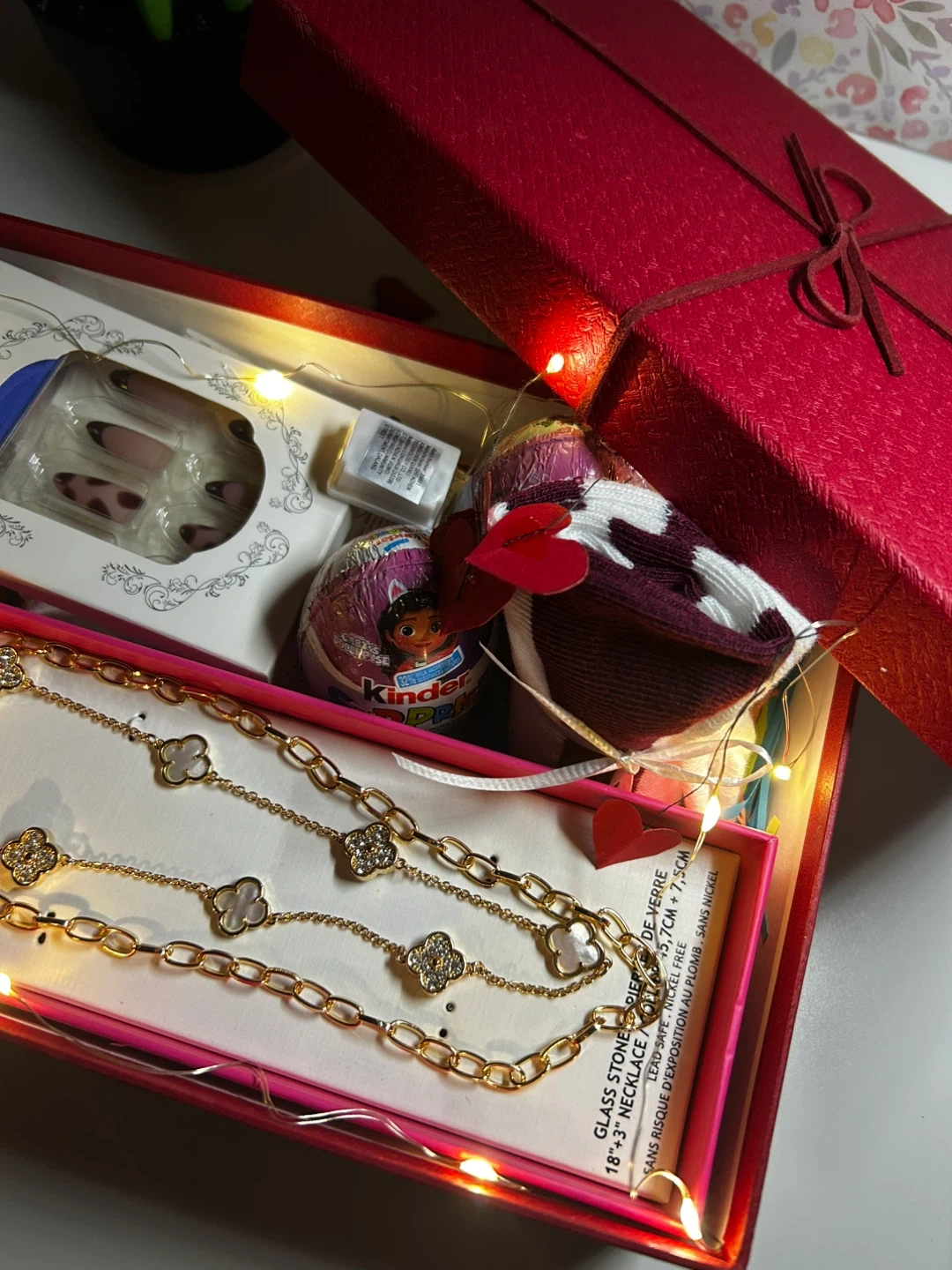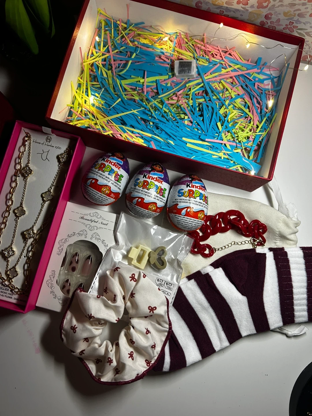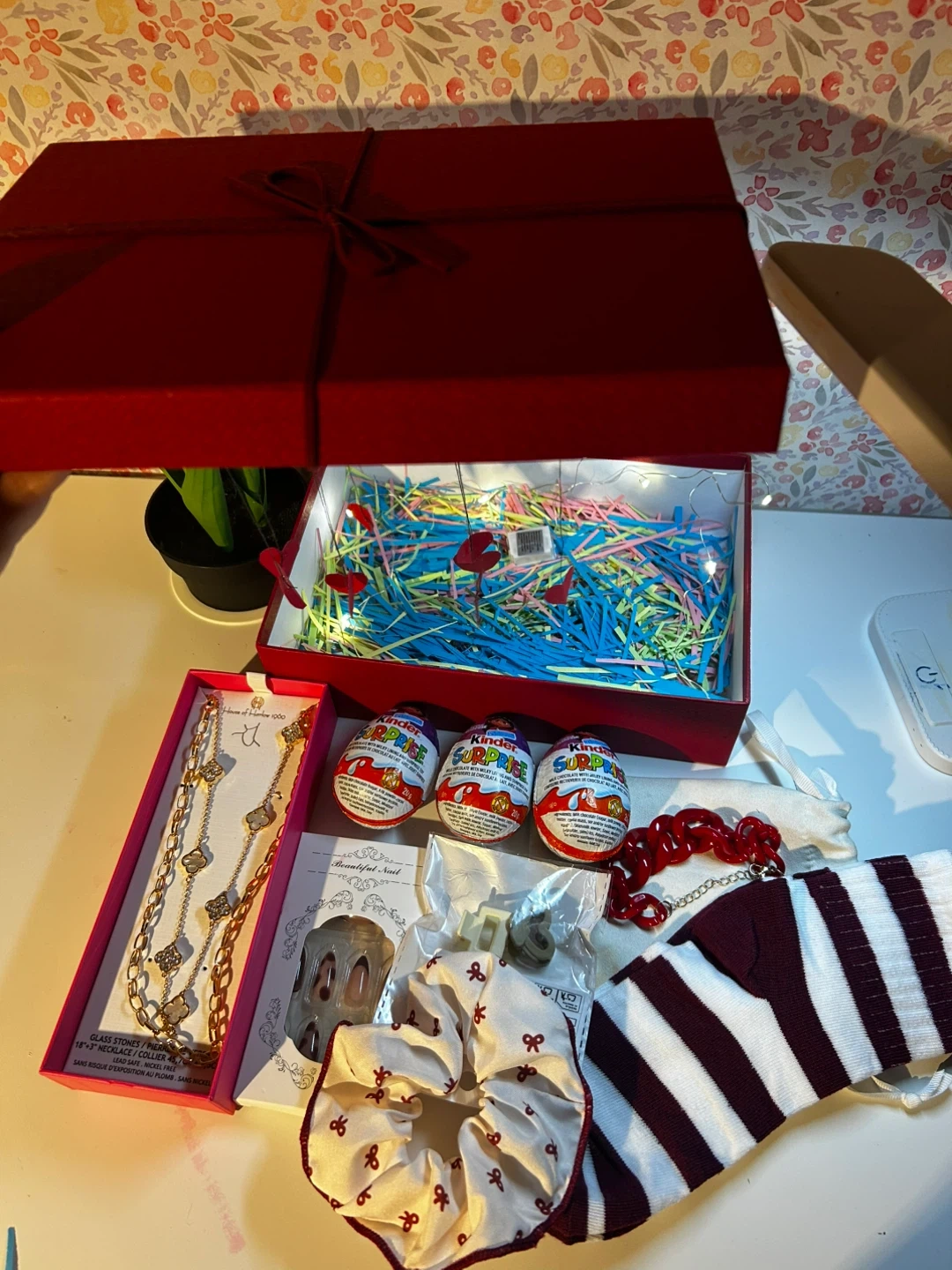 Selling a cute gift box filled with goodies! Includes a lovely gold-tone necklace, Kinder Surprise eggs, a scrunchie, and other fun items. Perfect for a little treat or a sweet surprise for someone special