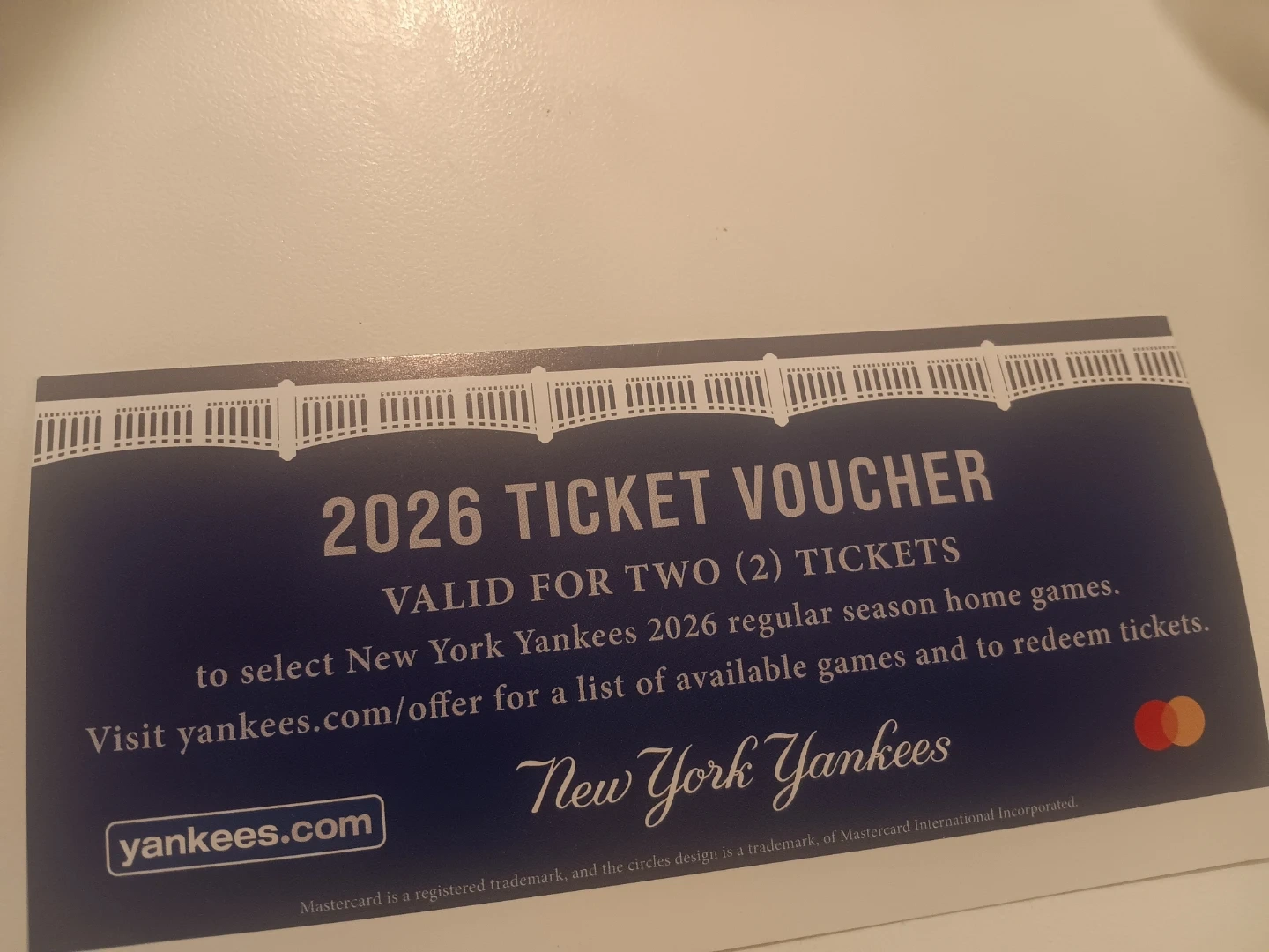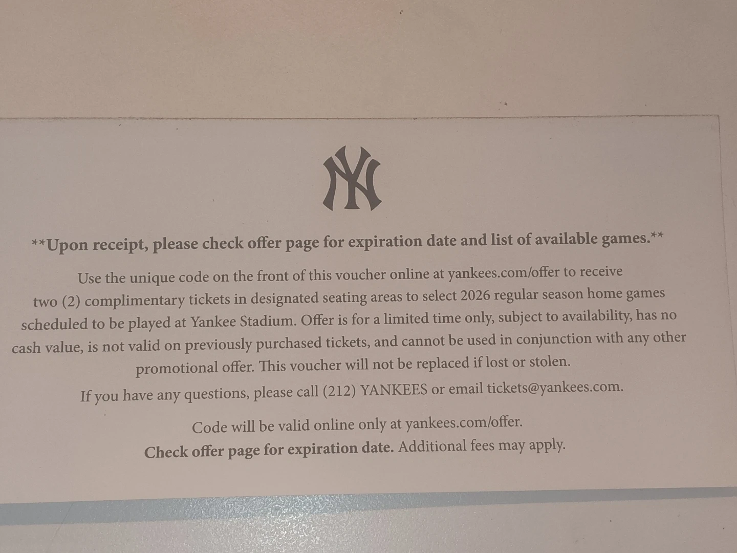 Selling a New York Yankees 2026 ticket voucher valid for two tickets to select regular season home games.