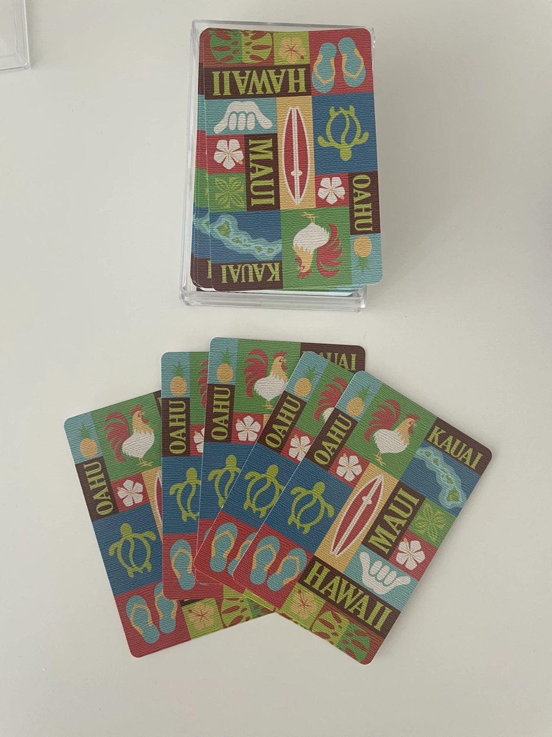 Selling a brand new deck of Aloha Print playing cards! The cards come in their original box and feature a fun Hawaiian-themed design with images of Kauai, Maui, Oahu and Hawaii