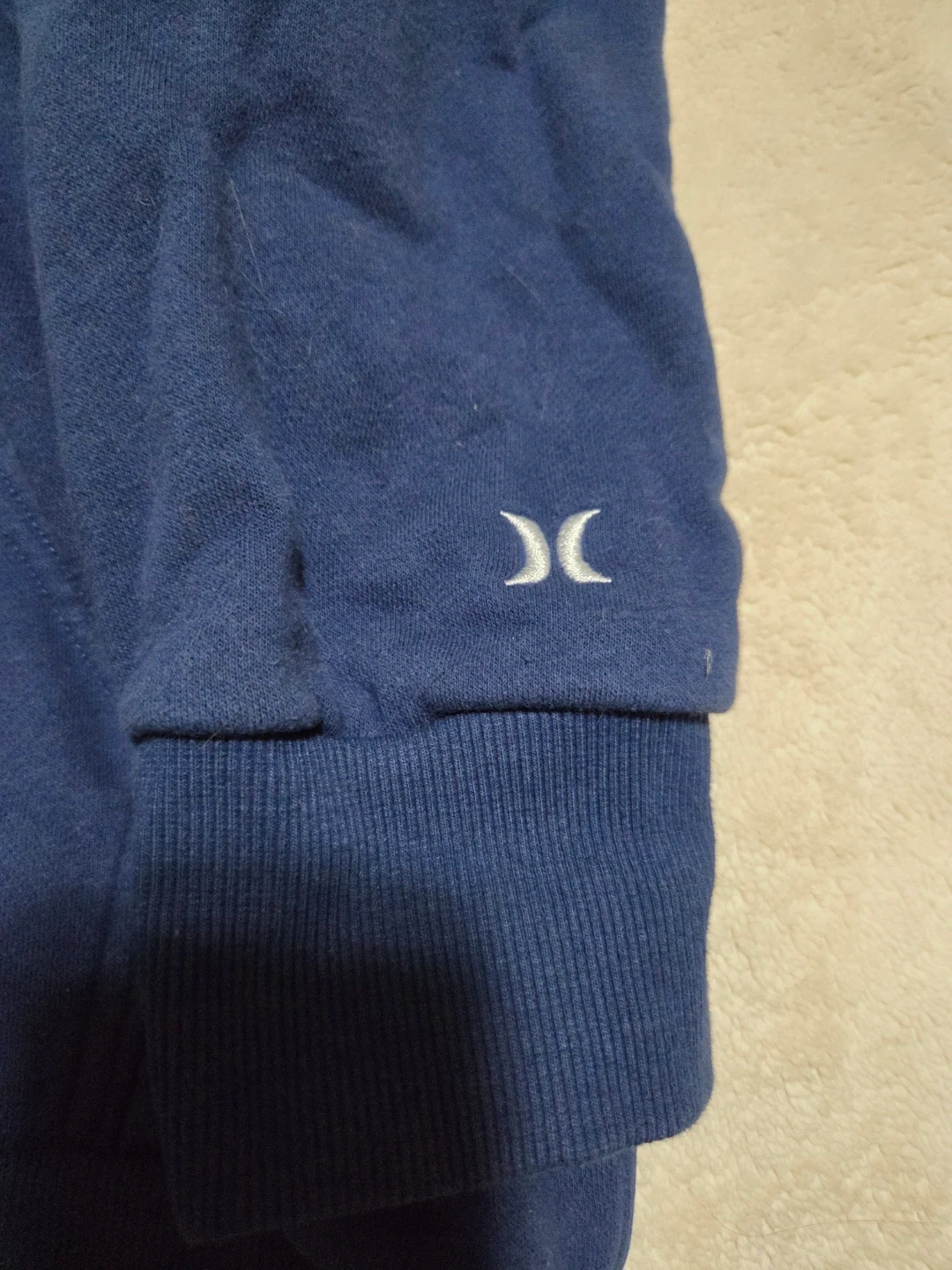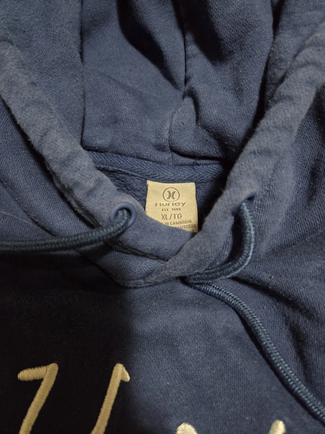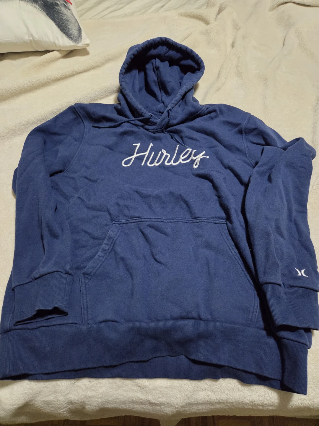 Selling a comfy Hurley hoodie in blue. It's a size XL. The hoodie has the Hurley logo on the front. Perfect for those cooler days!