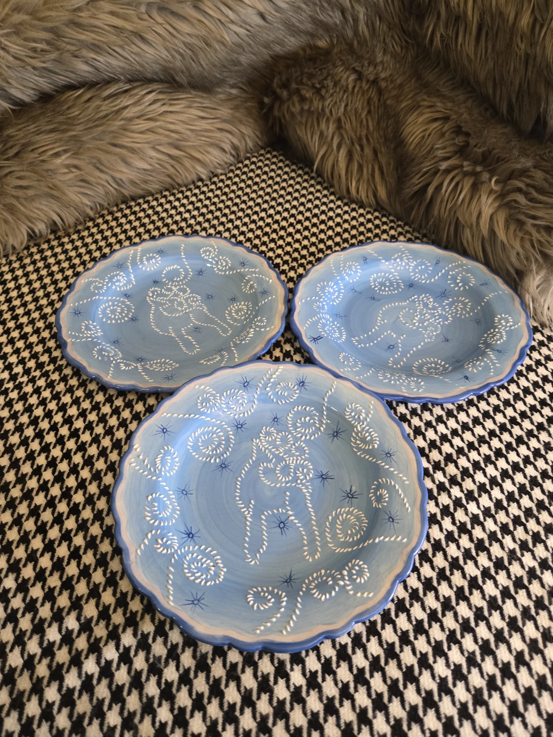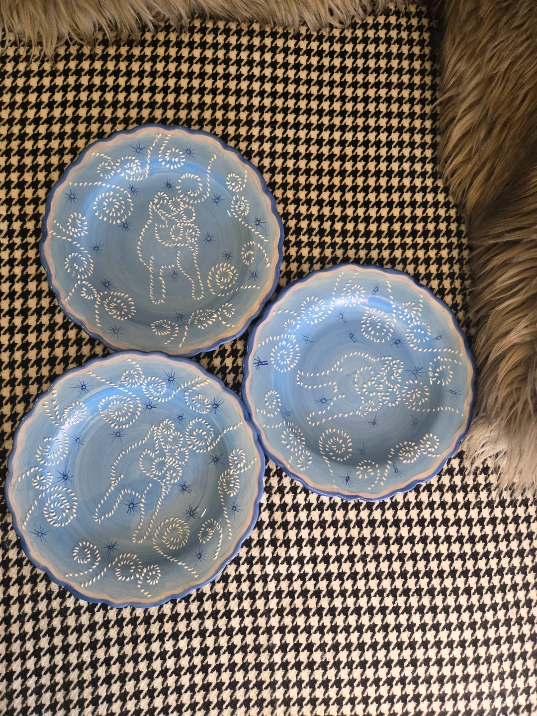 COLLECTORS ITEMS.A beautiful set of three decorative plates. These plates are a light blue colour with a unique design. They are in great condition and would be a lovely addition to any home!
