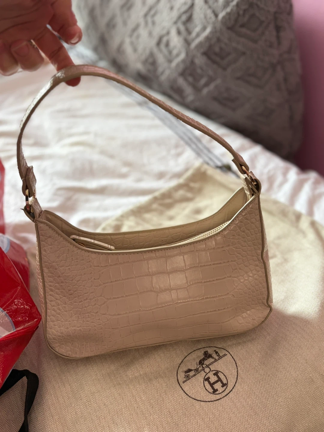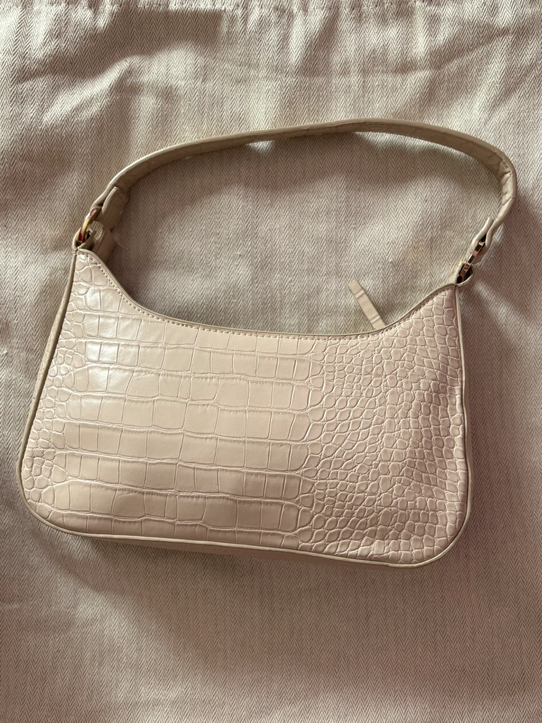 Selling a cute MNG shoulder bag! It's a beige color with a croc texture. Perfect for a night out or just running errands