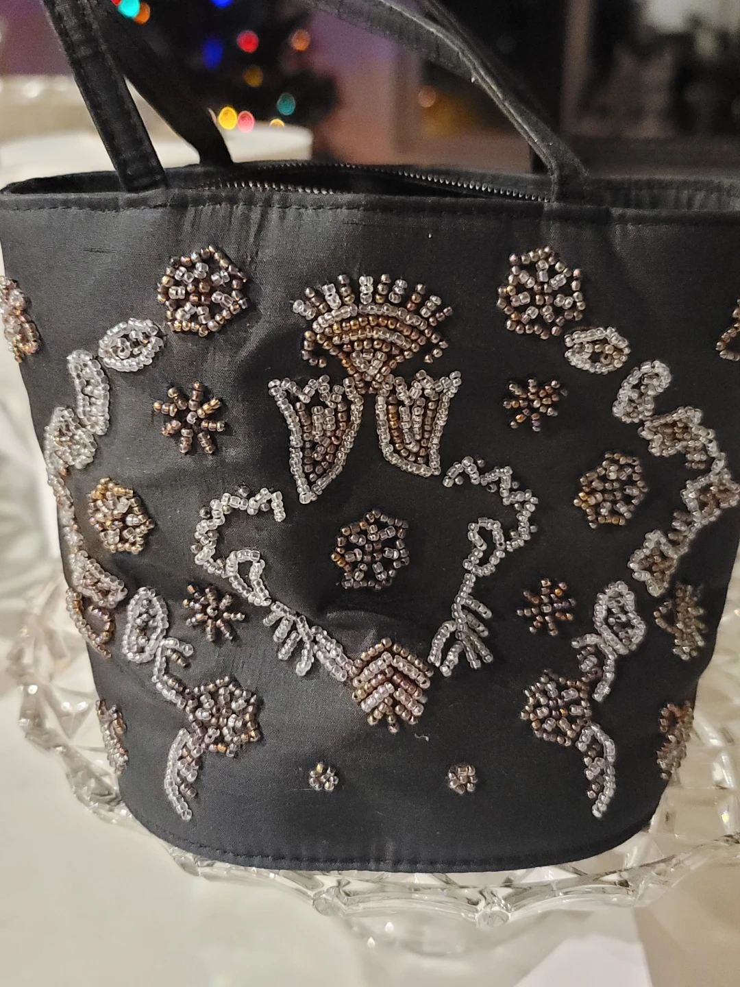 Selling a cute black handbag with beaded details! It's in great condition and perfect for a night out or special occasion. The inside is clean and has a zippered compartment for your valuables