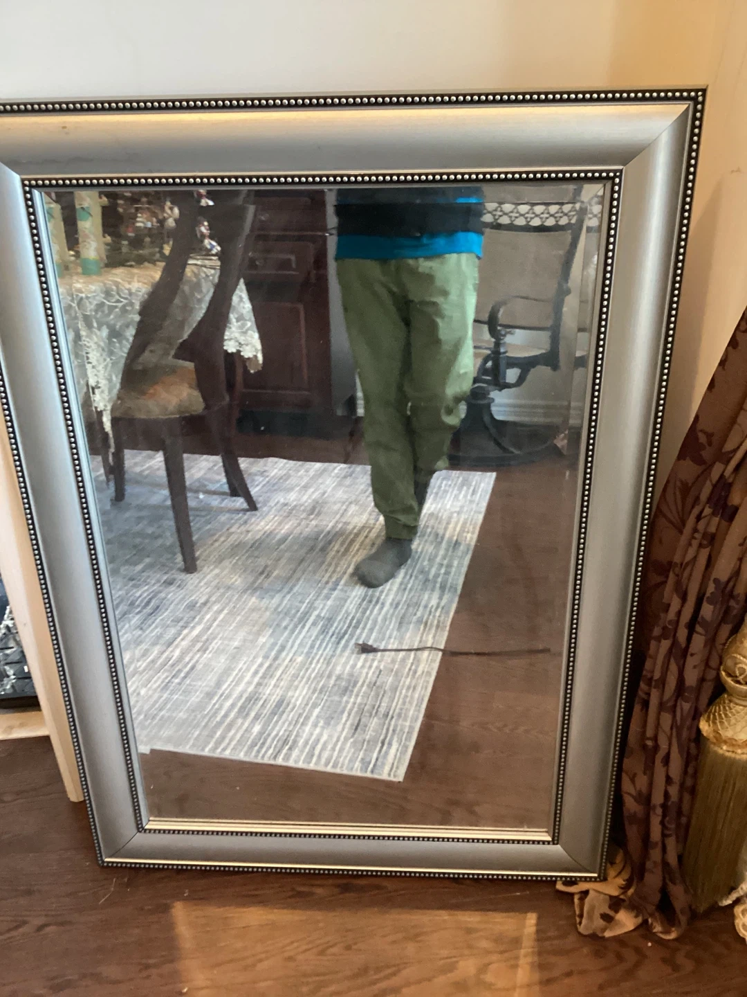 Selling a framed wall mirror, perfect for adding a touch of elegance to any room! The frame is a neutral silver colour. It's in great condition and ready to be hung