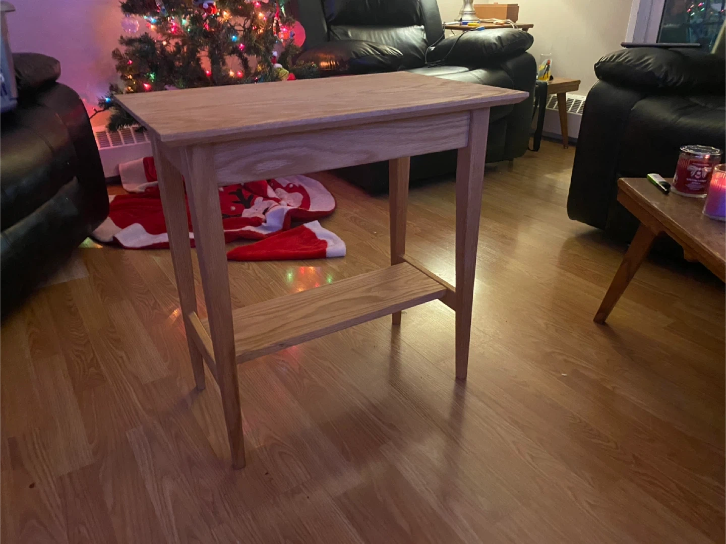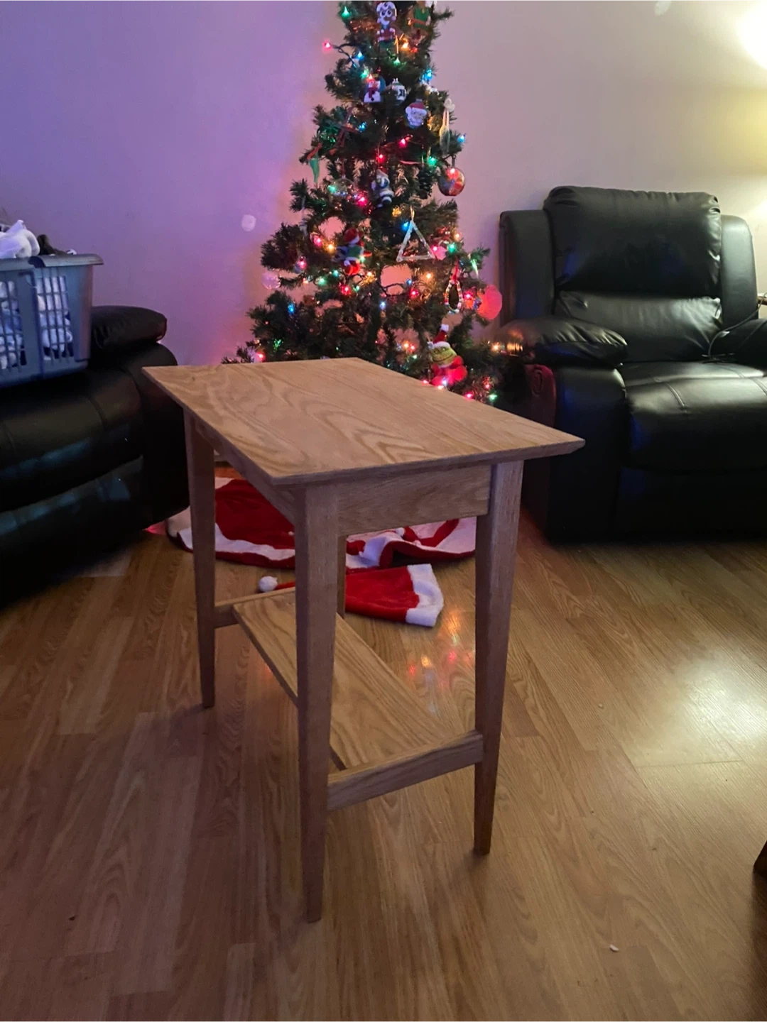 Selling a Hand Made oak side table. It's in great condition and perfect for a small space. It features a shelf for storage or display