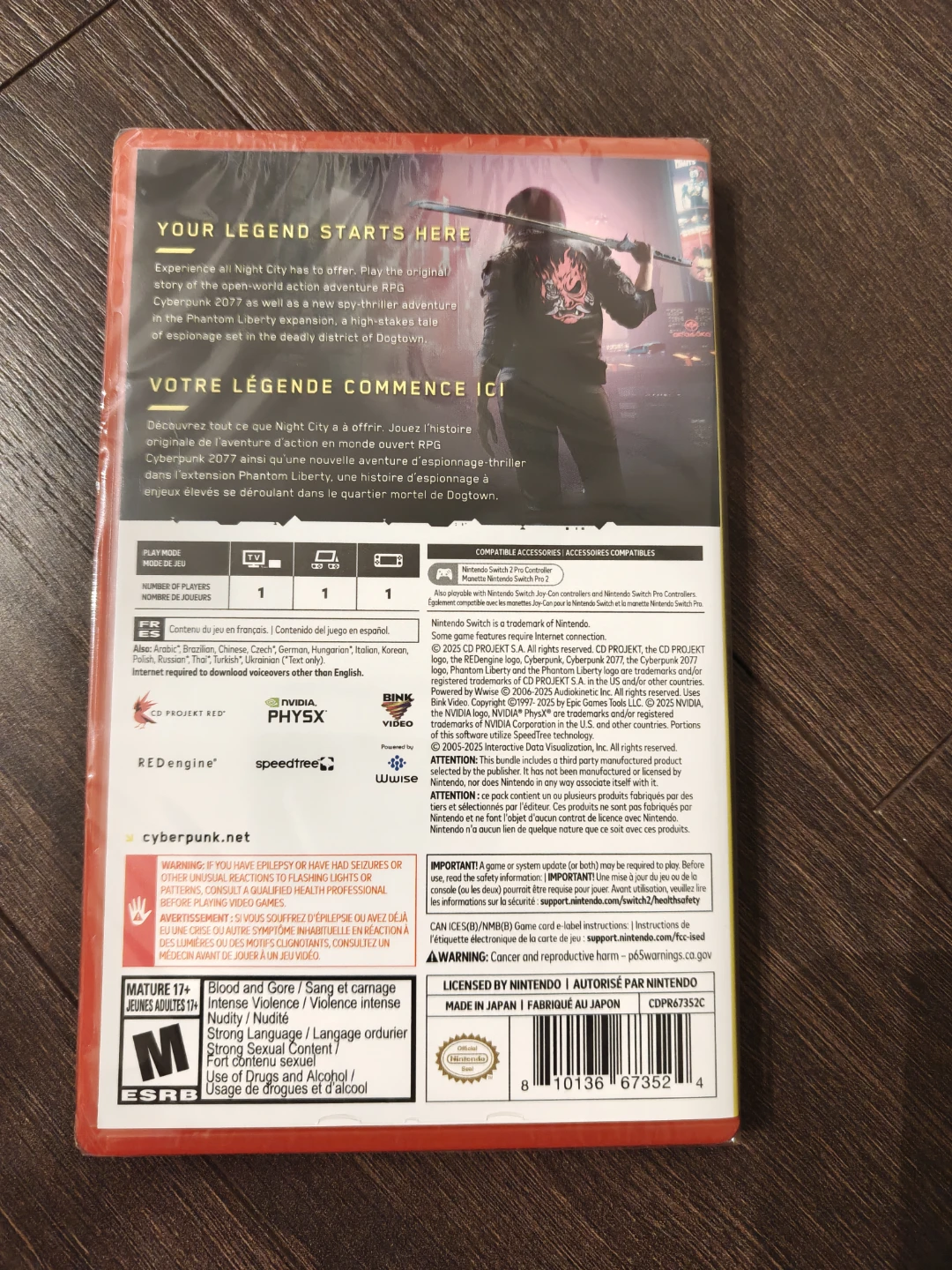 Selling a brand new, sealed copy of Cyberpunk 2077 Ultimate Edition for the Nintendo Switch 2! Experience the open-world action of Night City and the new spy-thriller adventure of Phantom Liberty. Full game and DLC are on cartridge, no Internet required. Great for collectors.